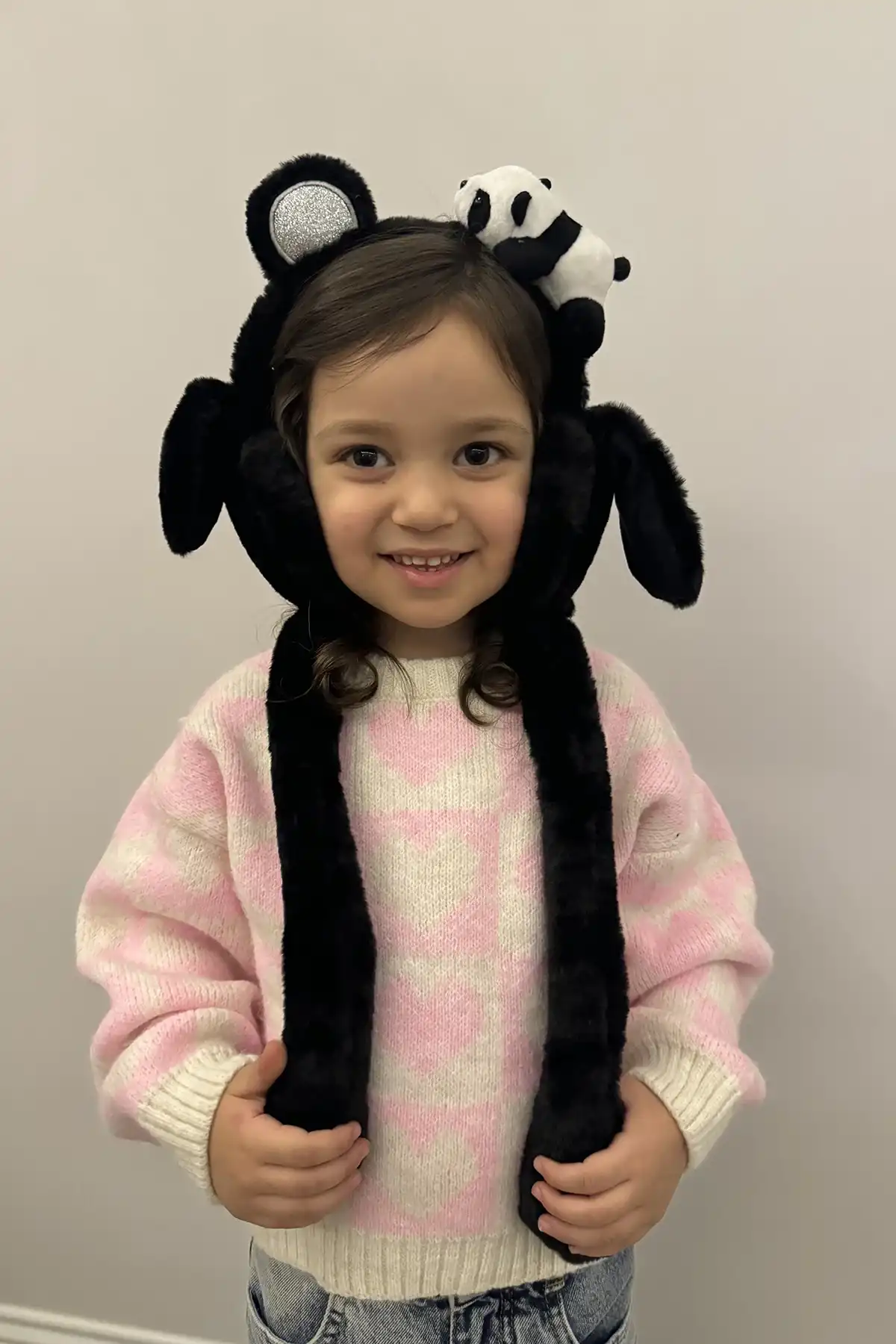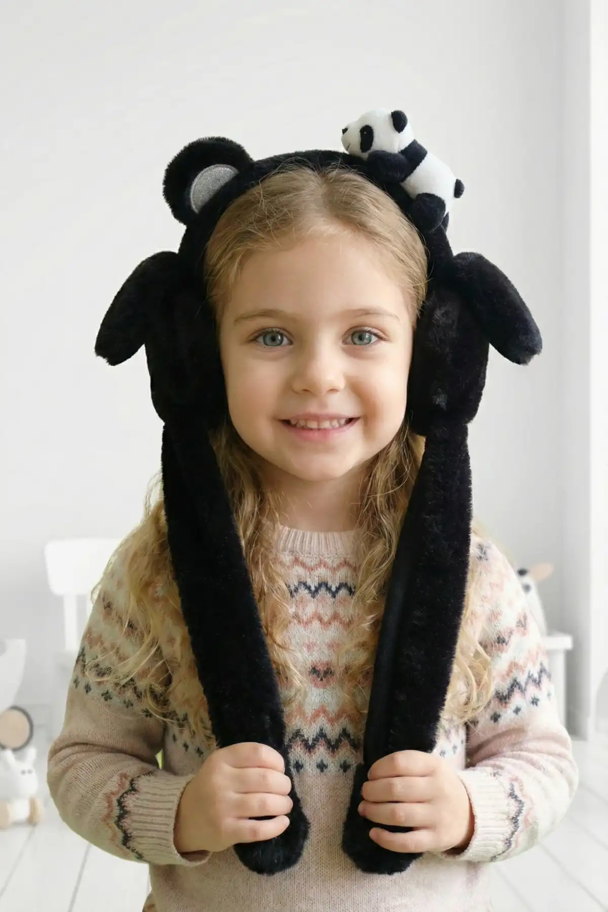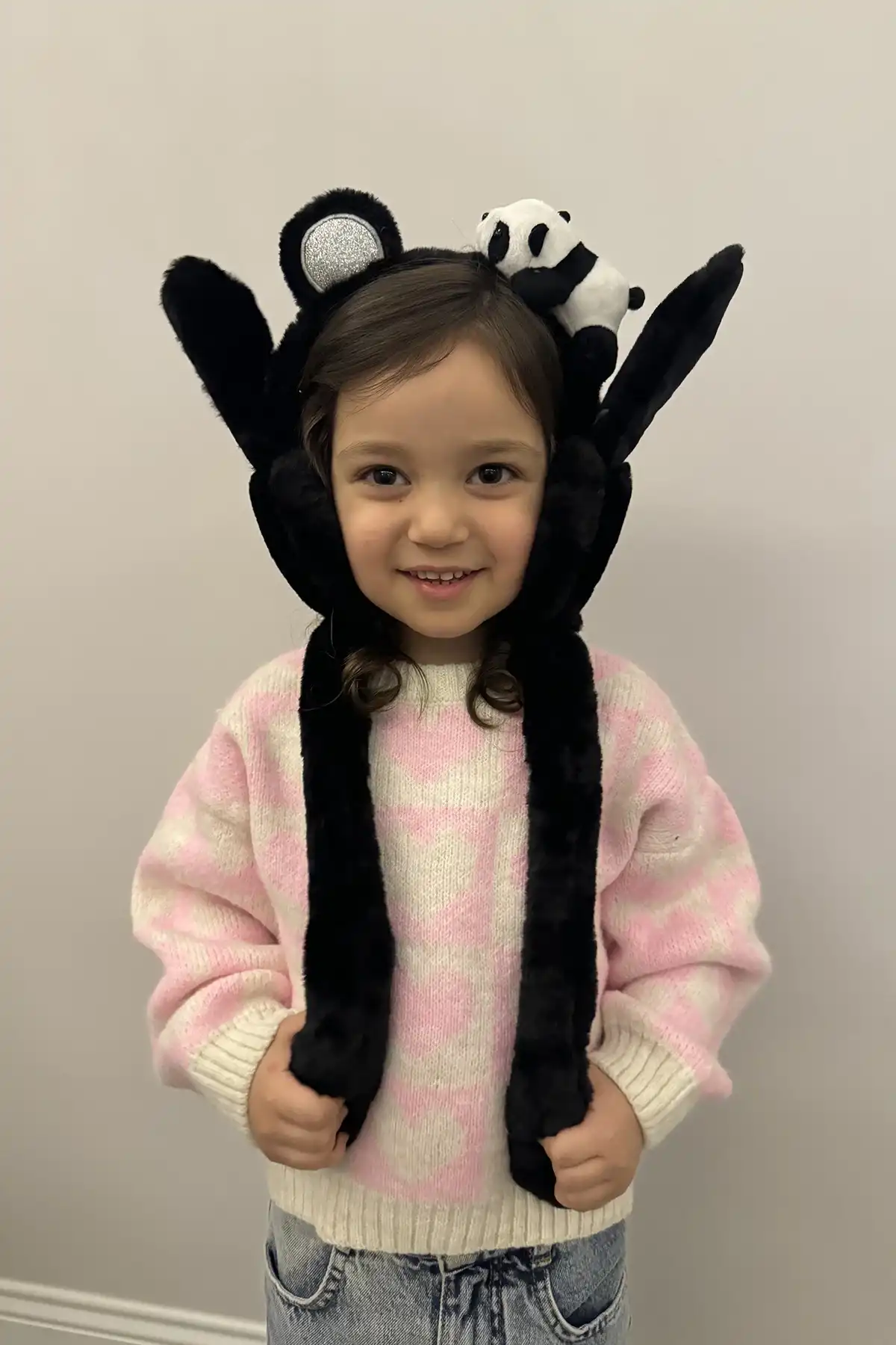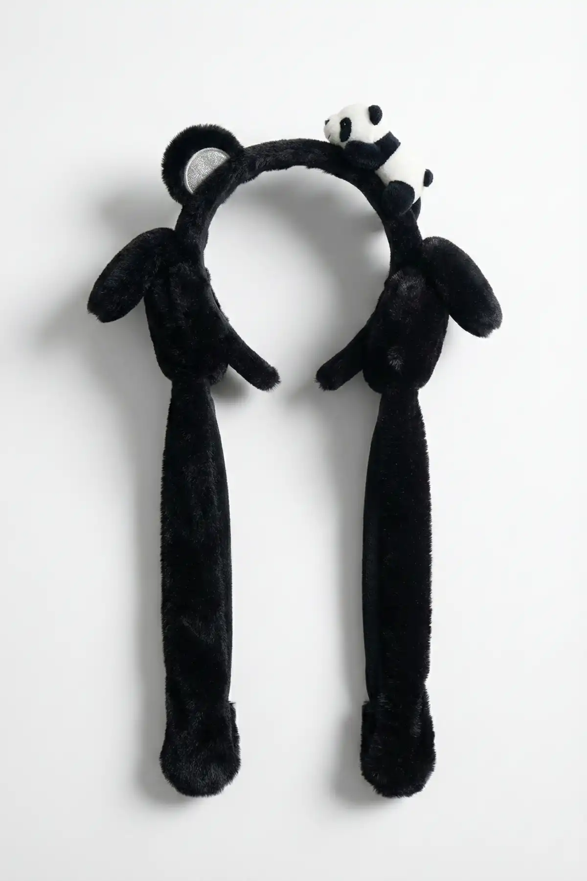 Kulakları Oynayan Siyah Peluş Çocuk Kulaklık – Panda Figürlü Kulak Isıtıcı, Uzun Bantlı Oynar Kulaklı