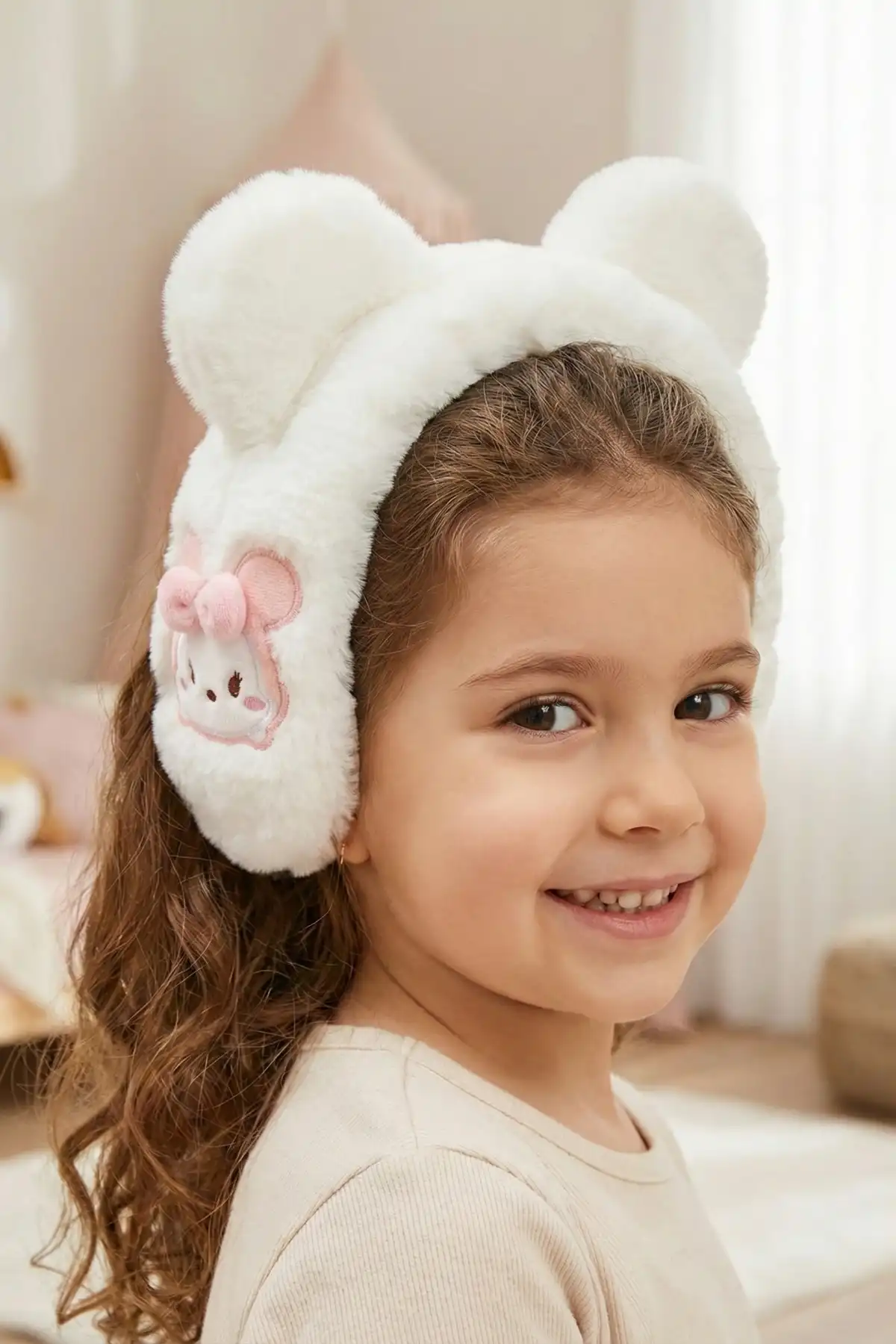 Çocuk Beyaz Tavşan Figürlü Peluş Kulaklık – Yumuşak Kışlık Kulak Isıtıcı