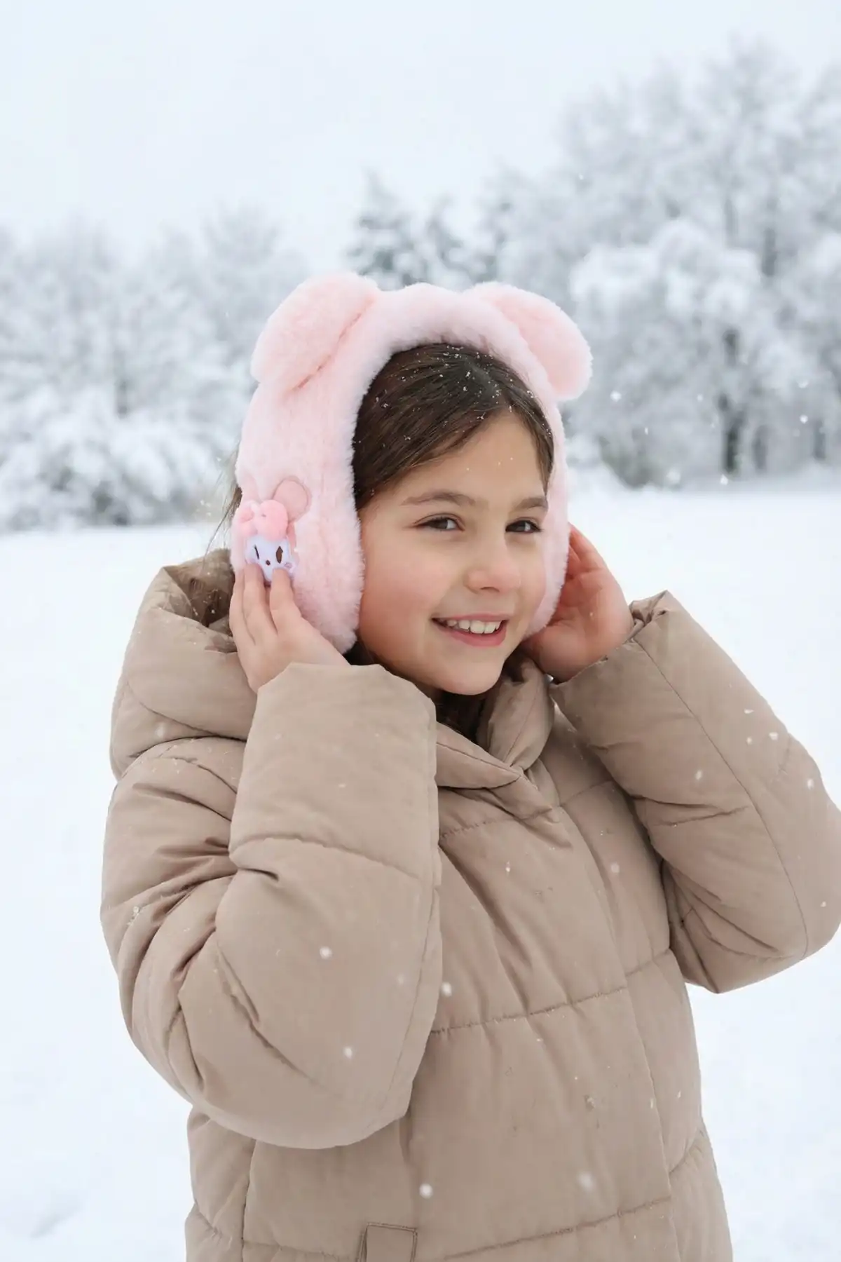 Çocuk Pembe Tavşan Figürlü Peluş Kulaklık – Sıcak Tutucu Kışlık Kulak Isıtıcı
