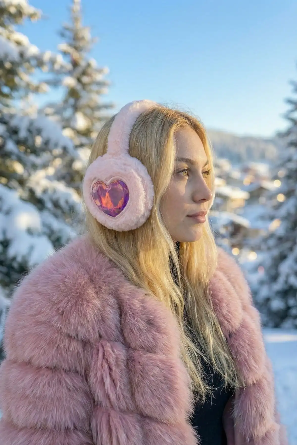 Pembe Peluş Kulaklık – Kalın Peluş, Kışlık Sıcak Tutma, Kalp Detaylı, Yumuşak, Şık Kulak Koruyucu