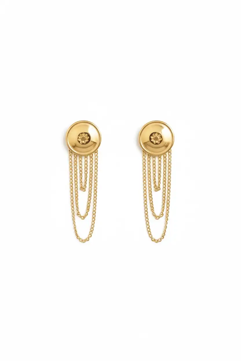 Şık ve modern tasarımlı, altın renk zincir detaylı çelik kadın küpe;