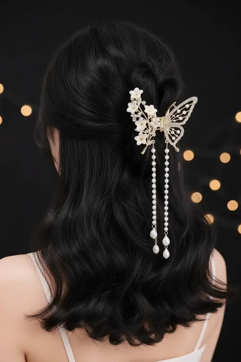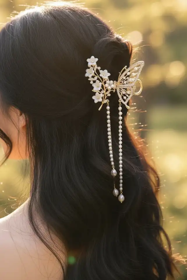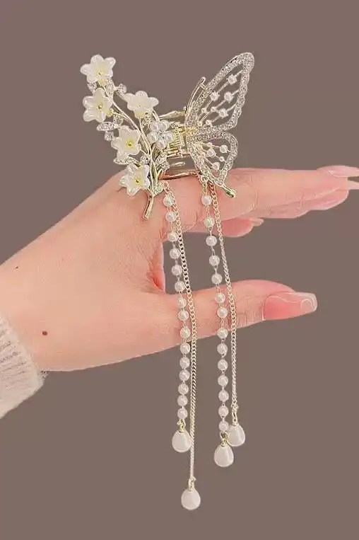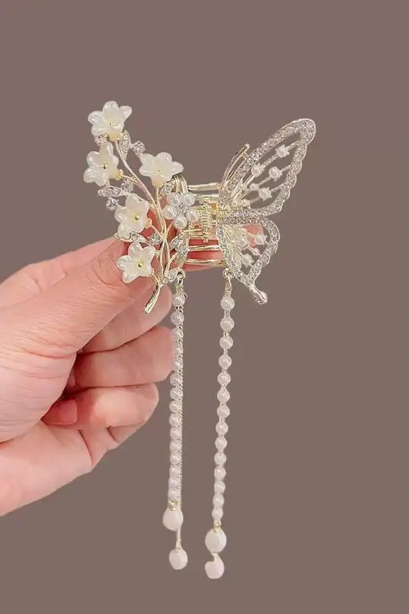 • Zarif kelebek figürü ve çiçek detaylarıyla tasarlanmış şık bir saç tokasıdır;