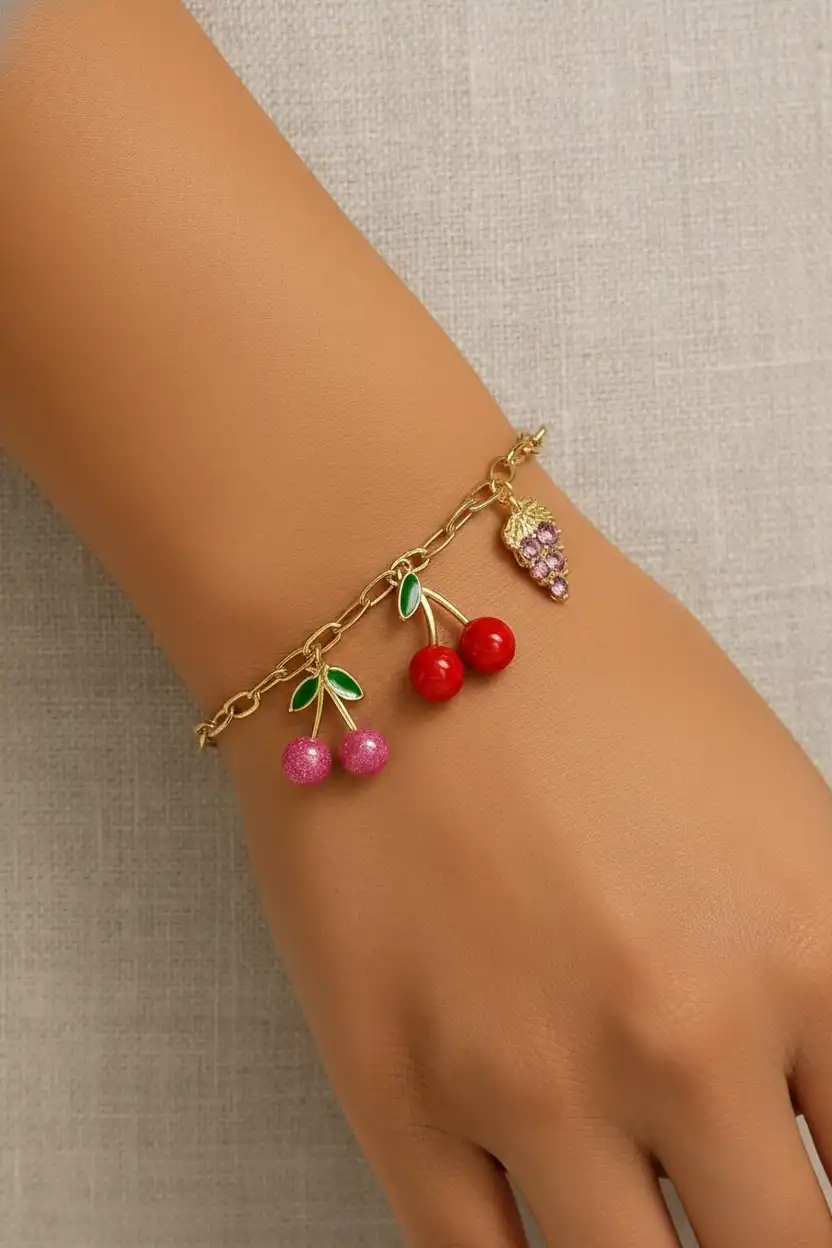 Renkli kiraz ve üzüm figürleriyle tasarlanmış şık charm bileklik, günlük kombinlere enerjik bir görünüm kazandırır;