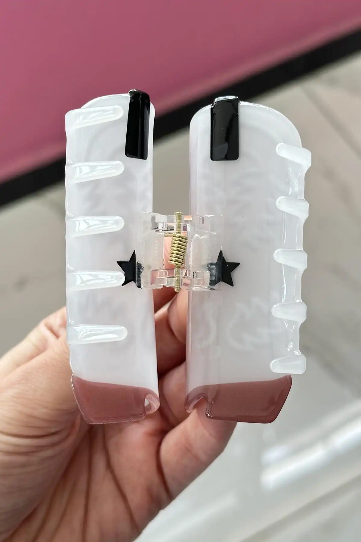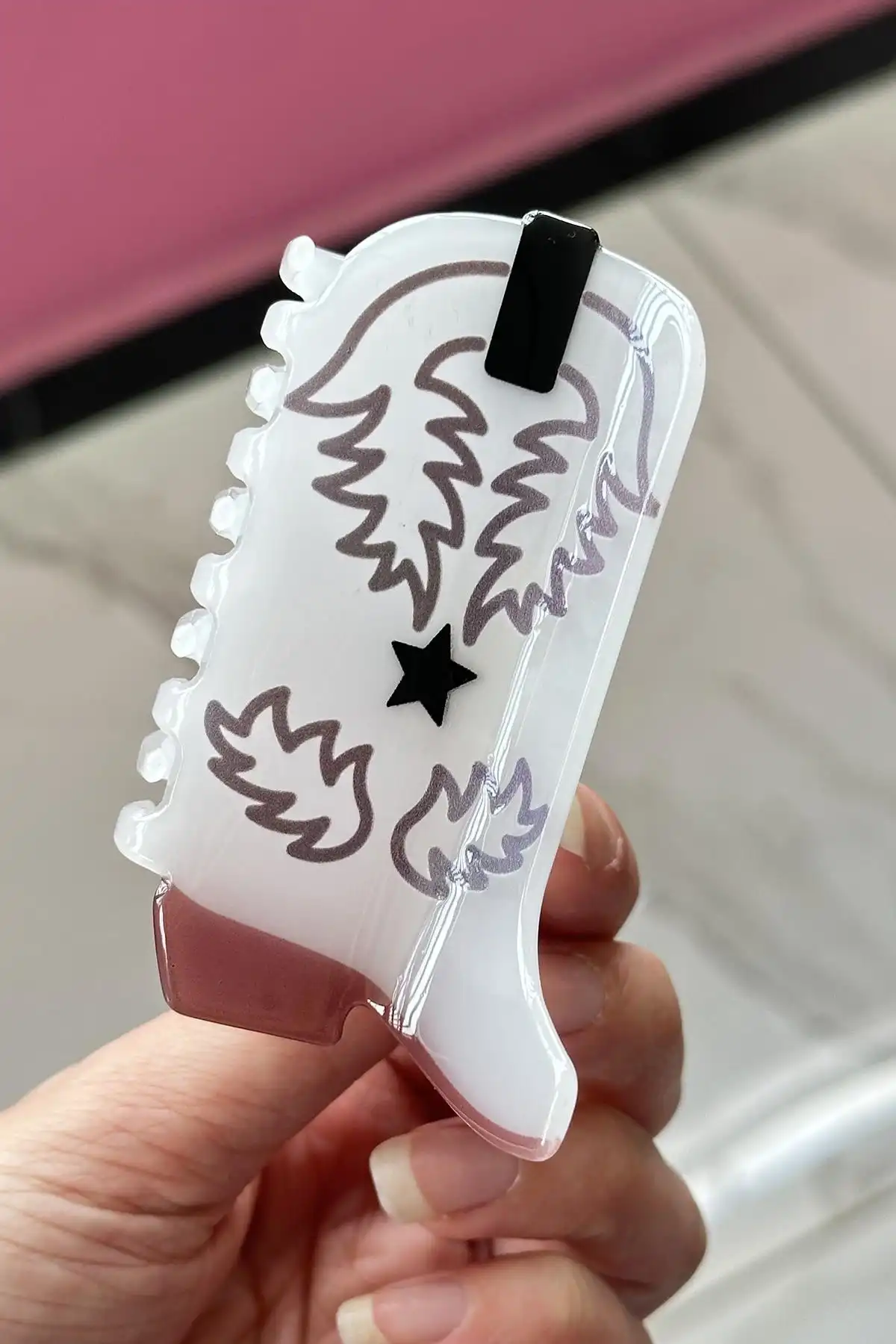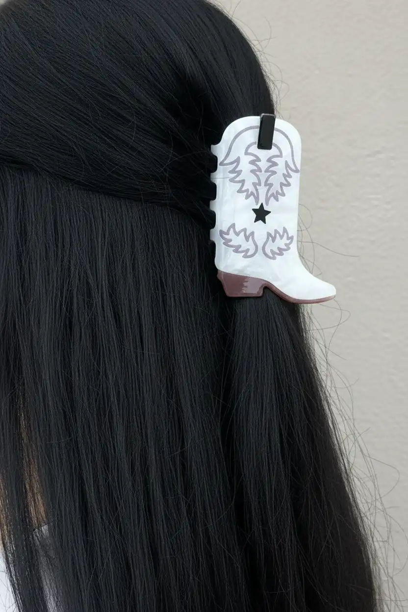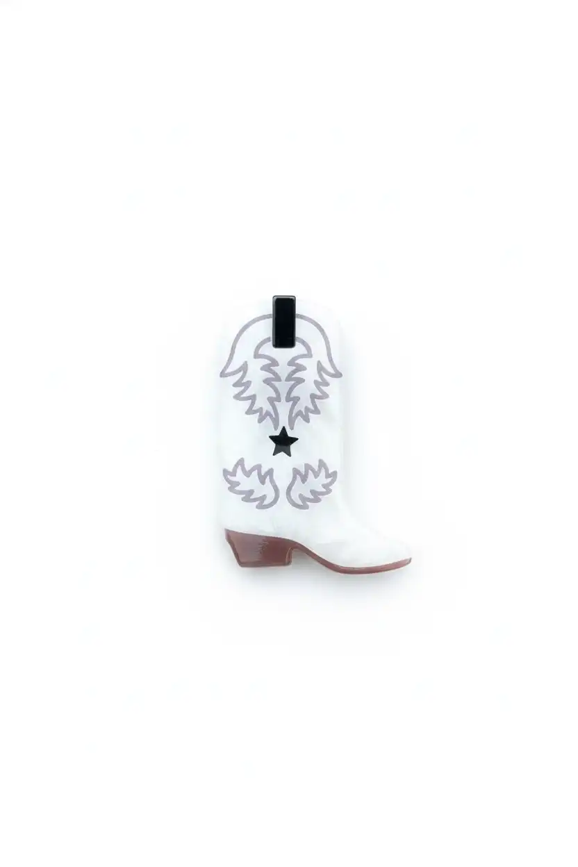 Western tarzının dikkat çekici çizgilerini taşıyan kovboy çizme desenli büyük boy mandal toka;