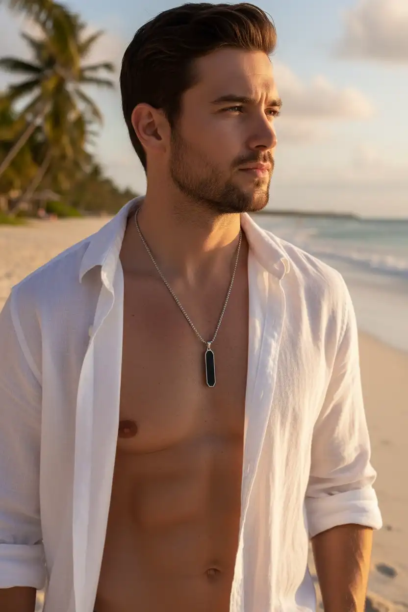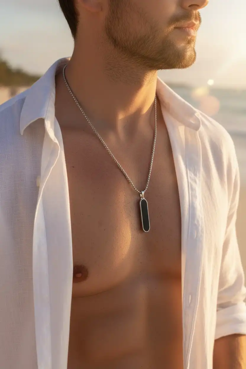 Siyah detaylı dikdörtgen ucu ile modern tarzı yansıtan bu erkek kolye, sade ama güçlü bir görünüm sunar;