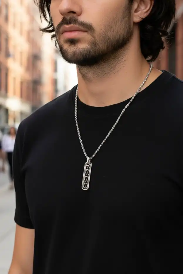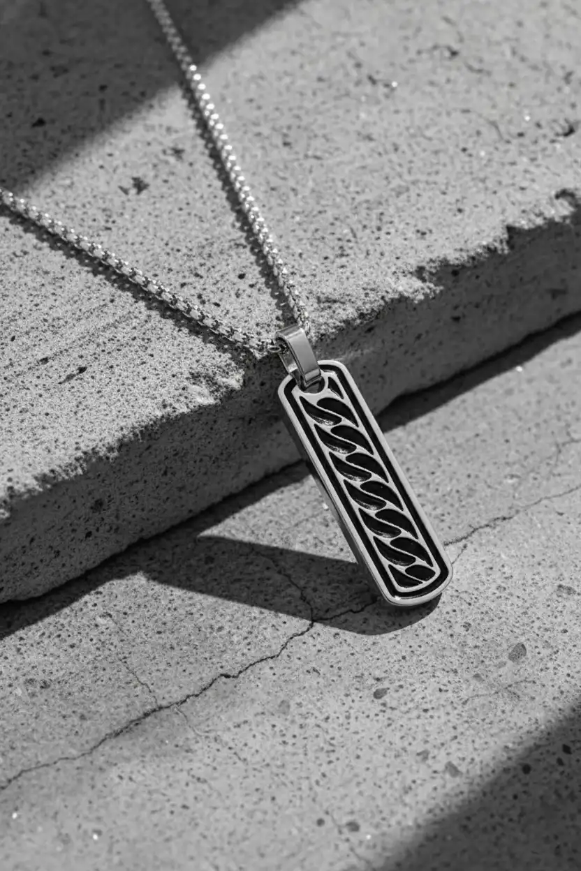 Geometrik desen detaylı bu dikdörtgen erkek kolye, sade ama dikkat çekici tarzıyla öne çıkar;