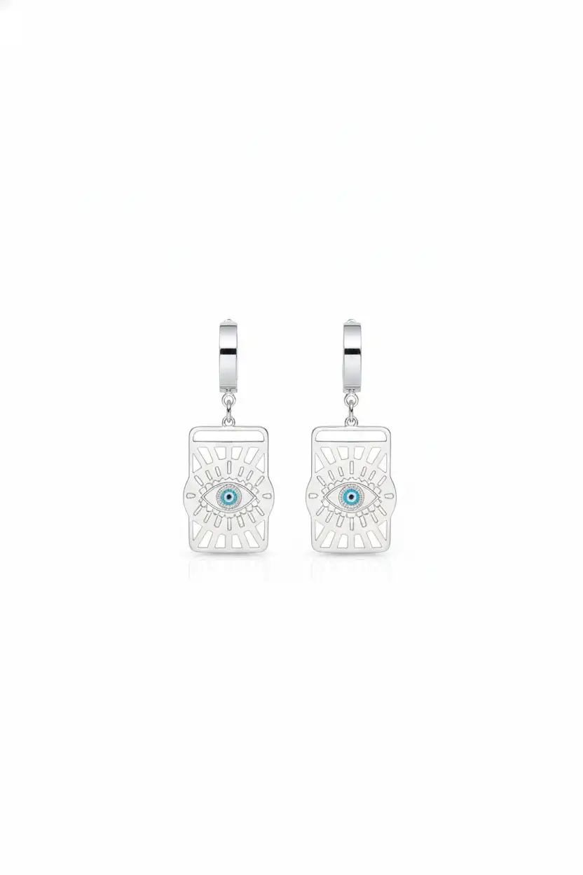 Modern ve dikkat çekici nazar göz detaylı sallantılı çelik kadın küpe;