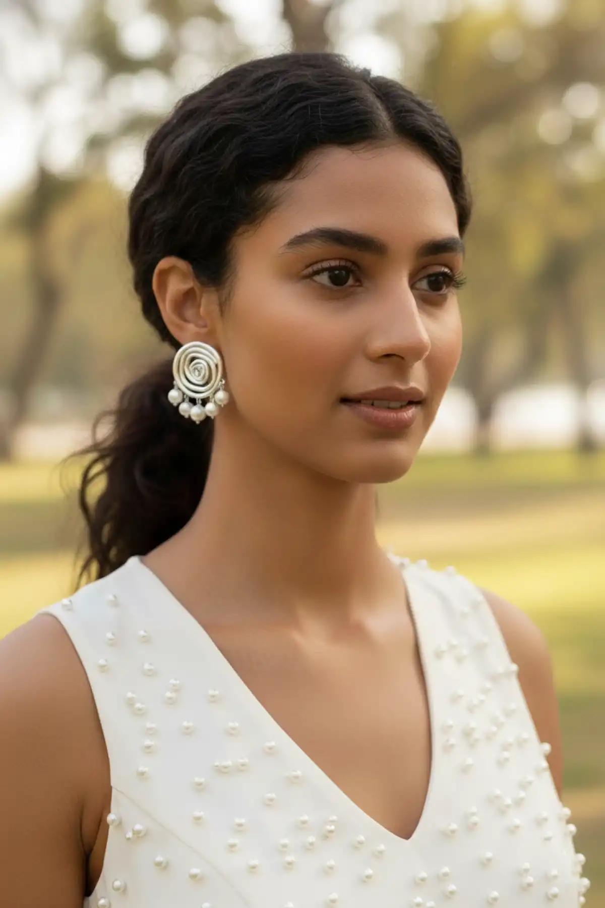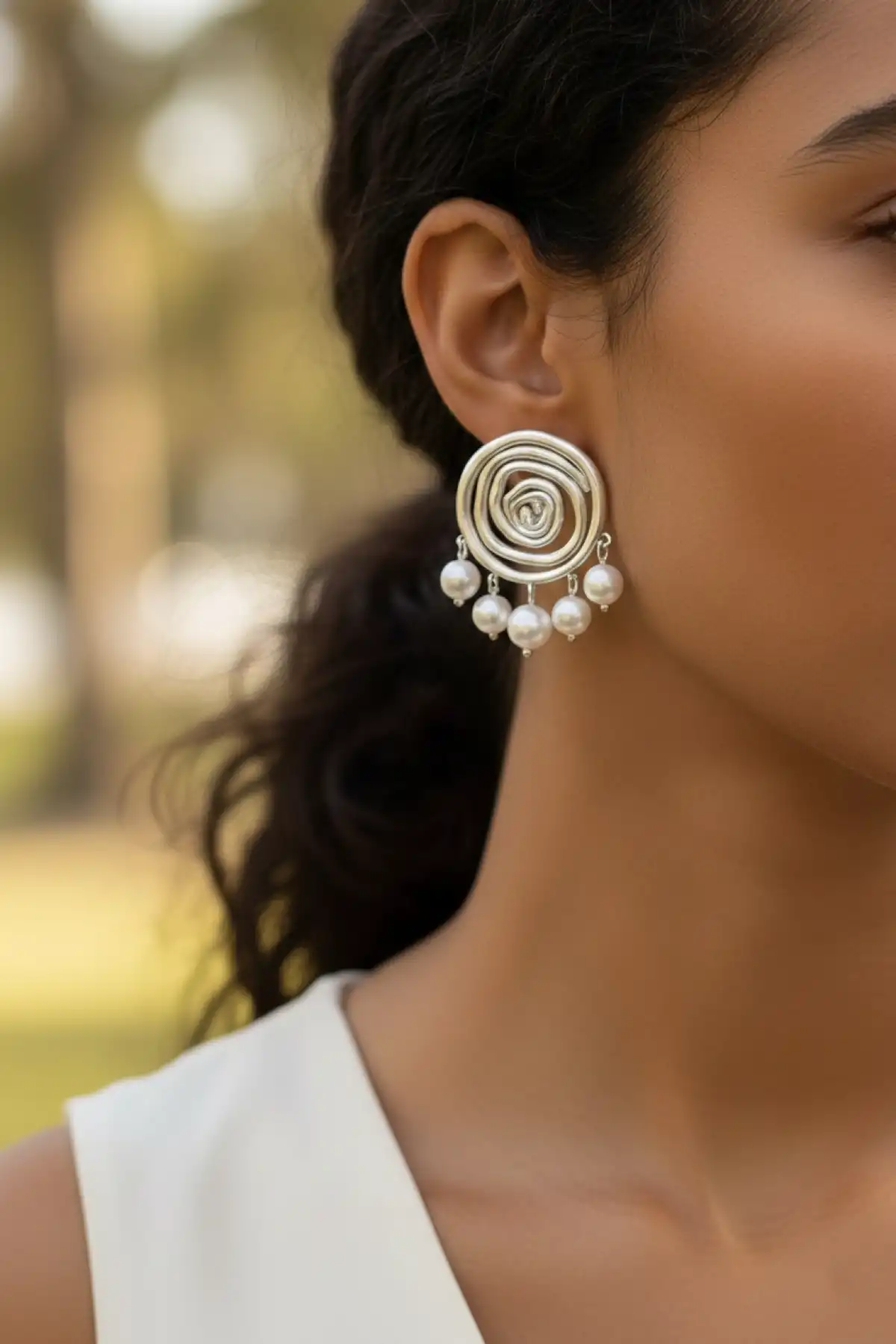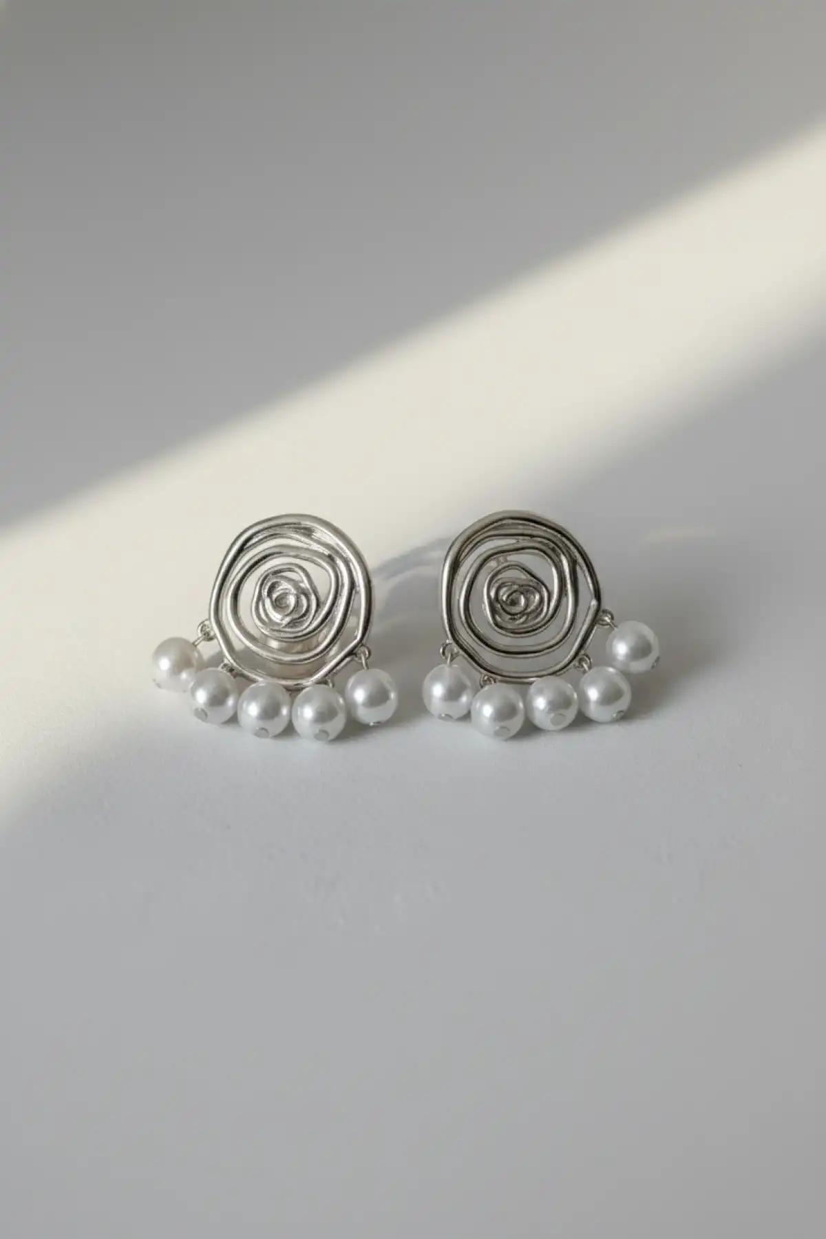 Spiral Motifli İnci Detaylı Gümüş Renk Paslanmaz Çelik Küpe