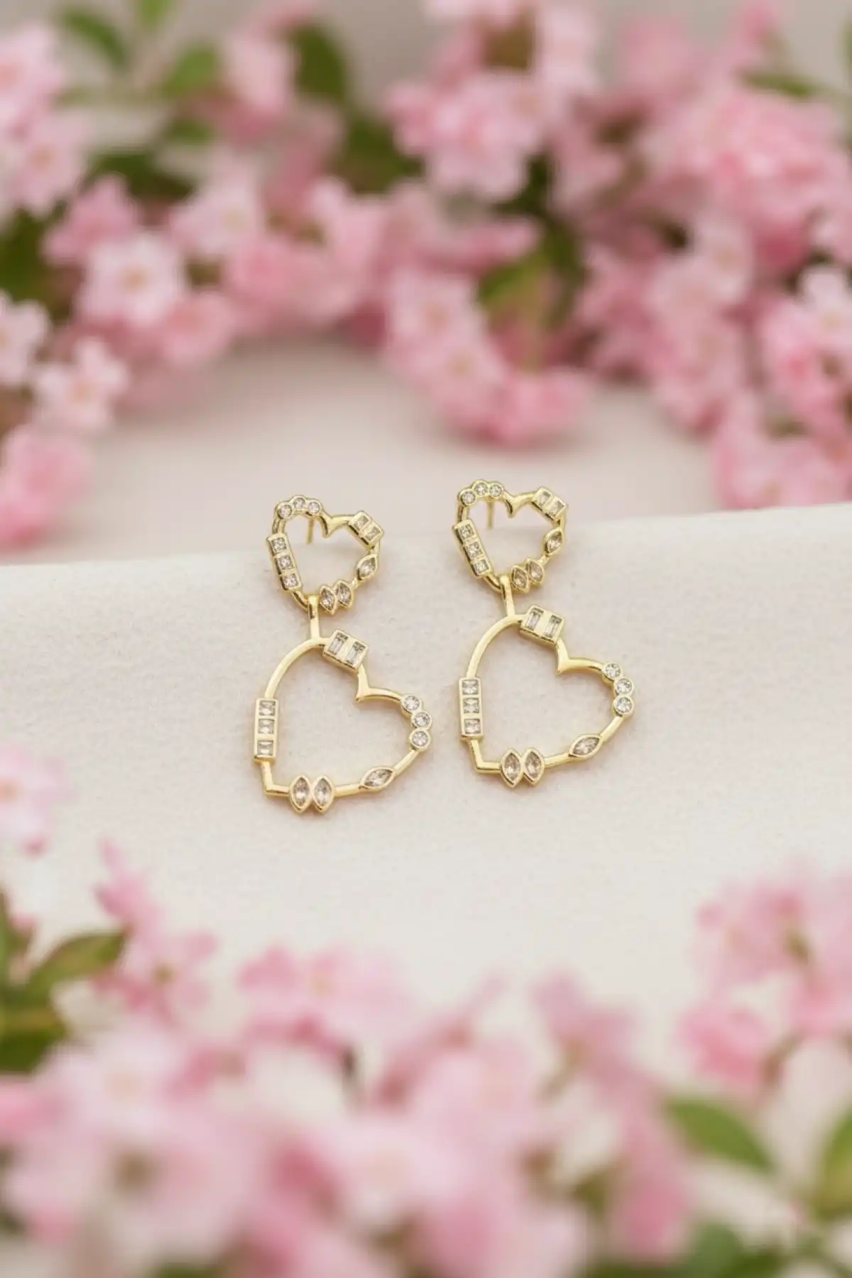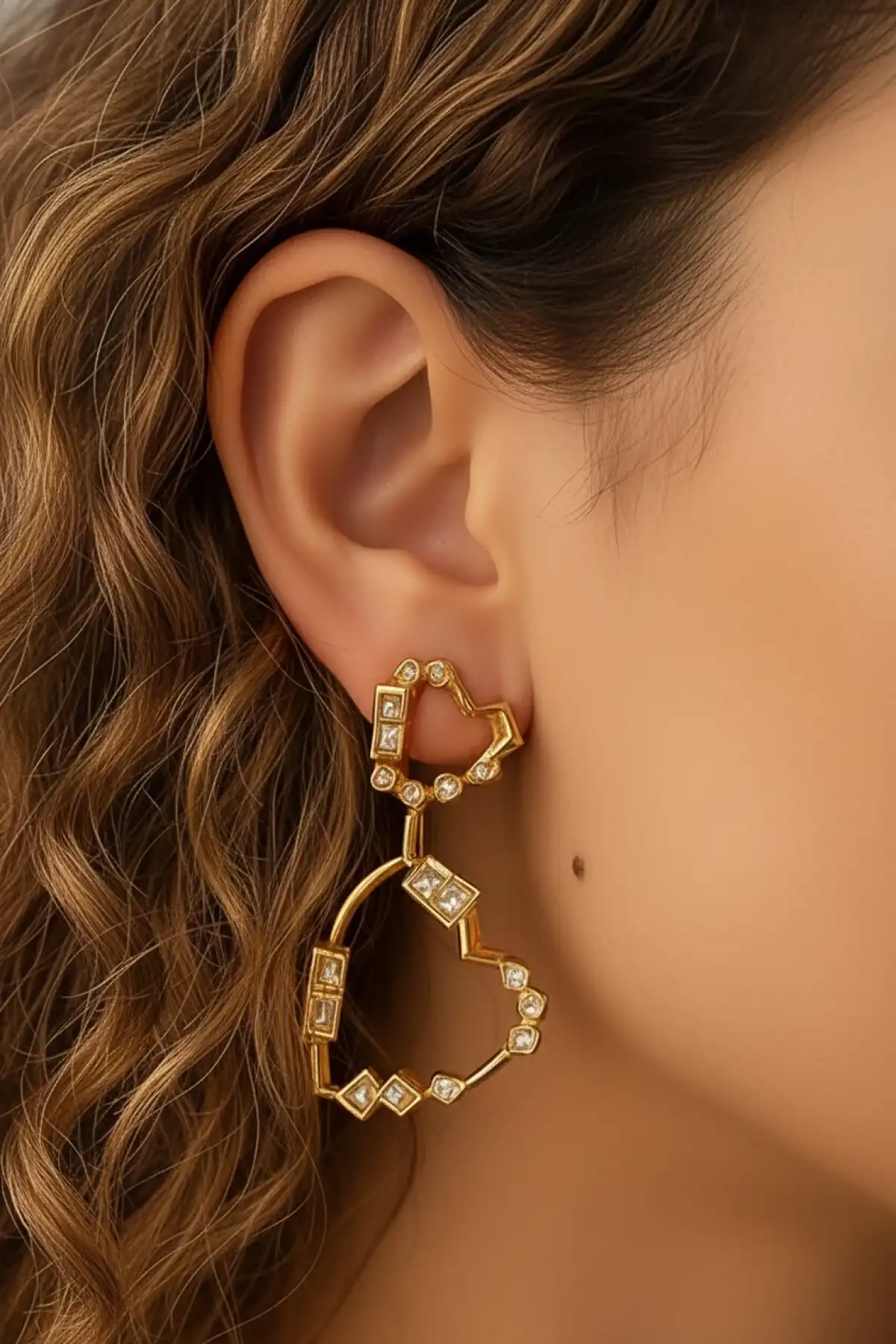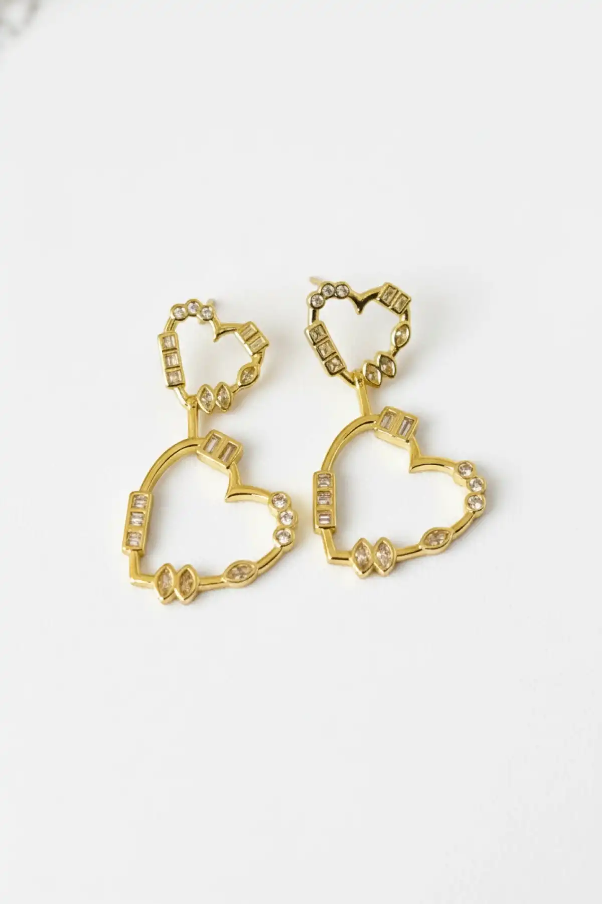 Kalp Figürlü Taşlı Altın Renk Paslanmaz Çelik Küpe