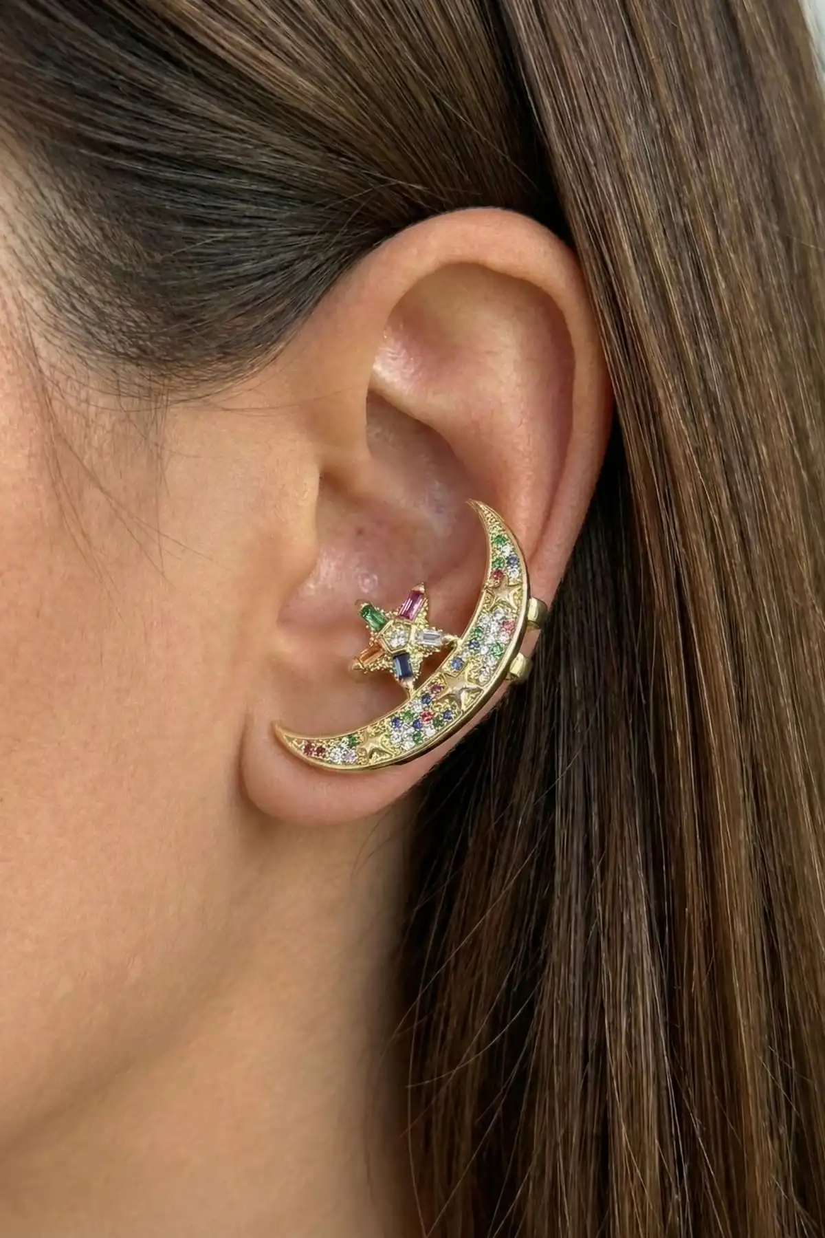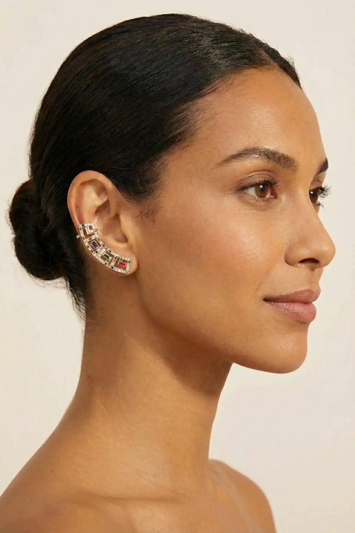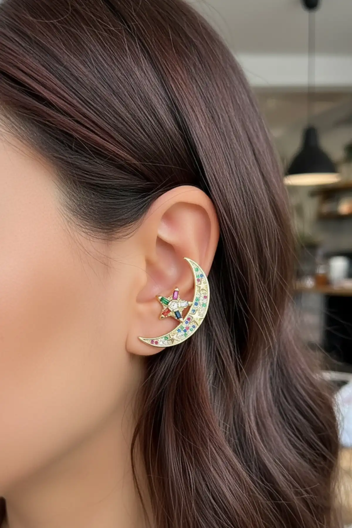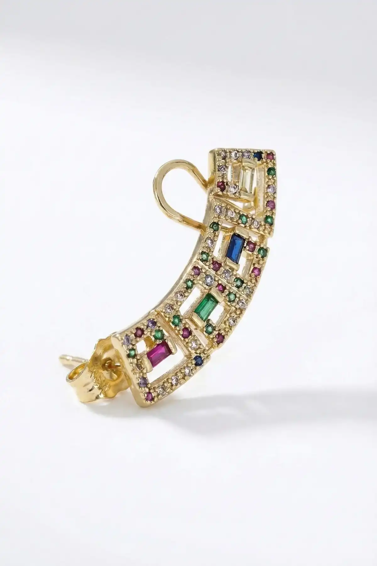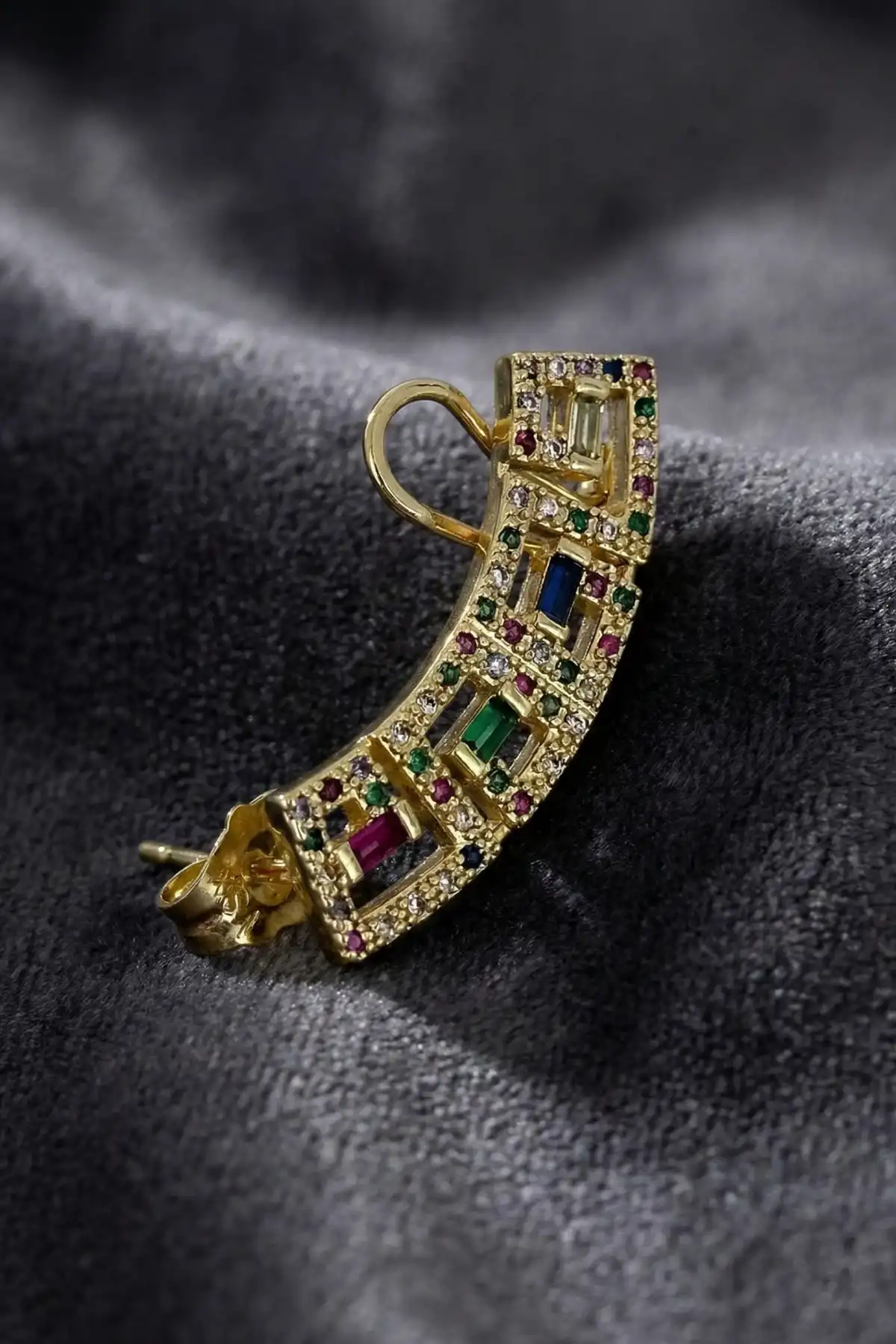Kadın Renkli Taşlı Ear Cuff Ear Wrap Küpe – Kıstırmalı Işıltılı Tasarım, Altın Kaplama Trend Model