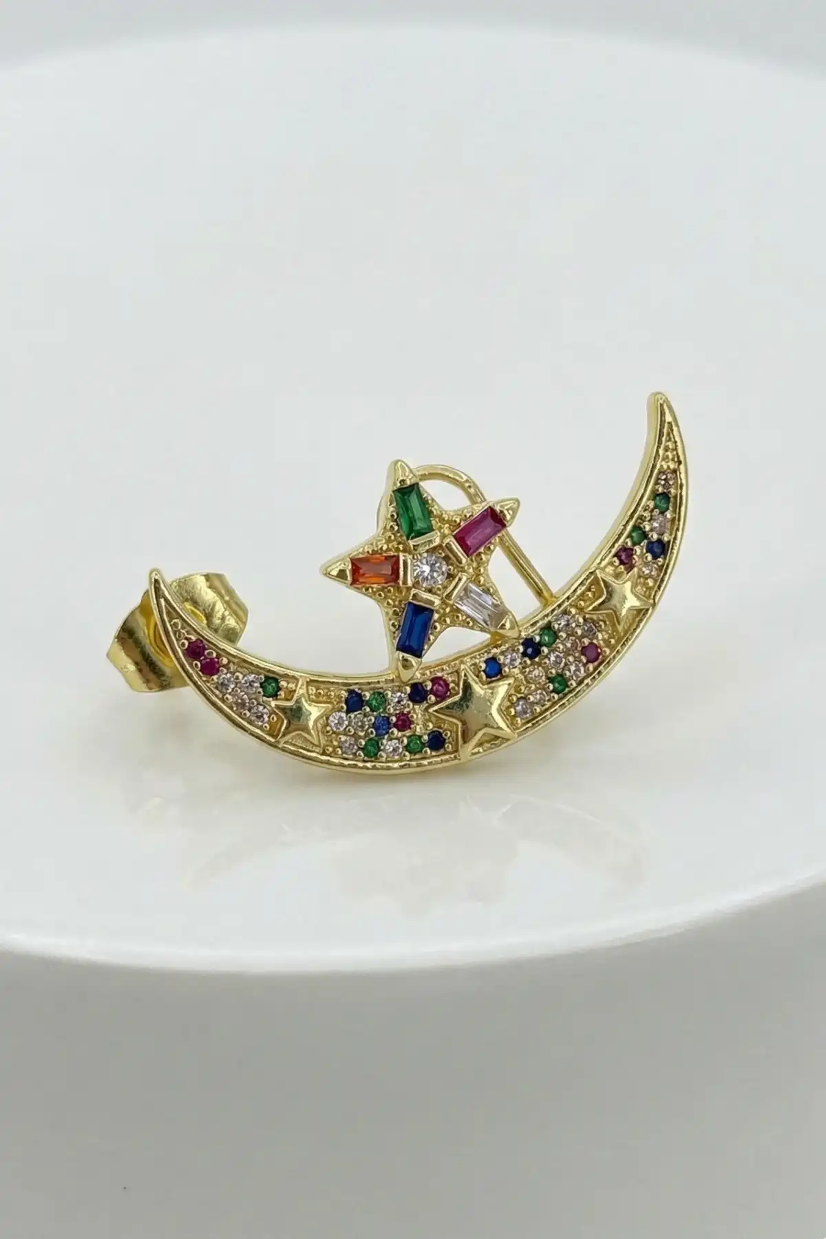 Hilal ve Yıldız Tasarım Renkli Taşlı Küpe – Kararmaz Çelik, Şık Kadın Küpe