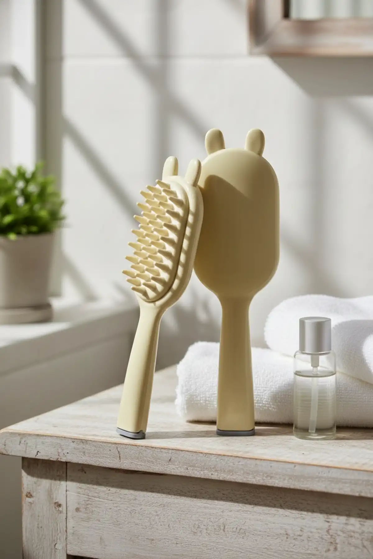 Açık Kahverengi Kulak Detaylı Saç Fırçası – Masaj Etkili Anti-Kırılma