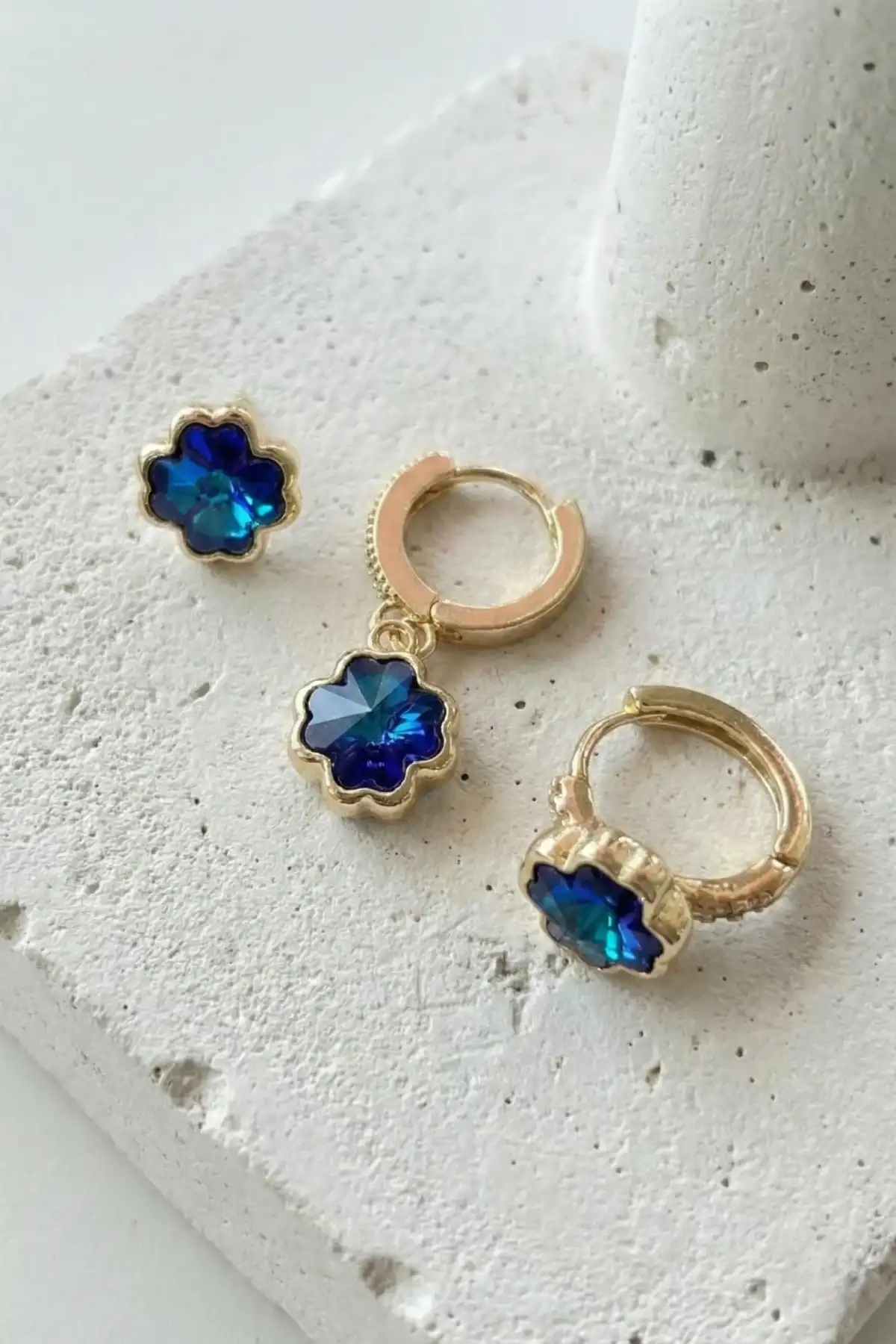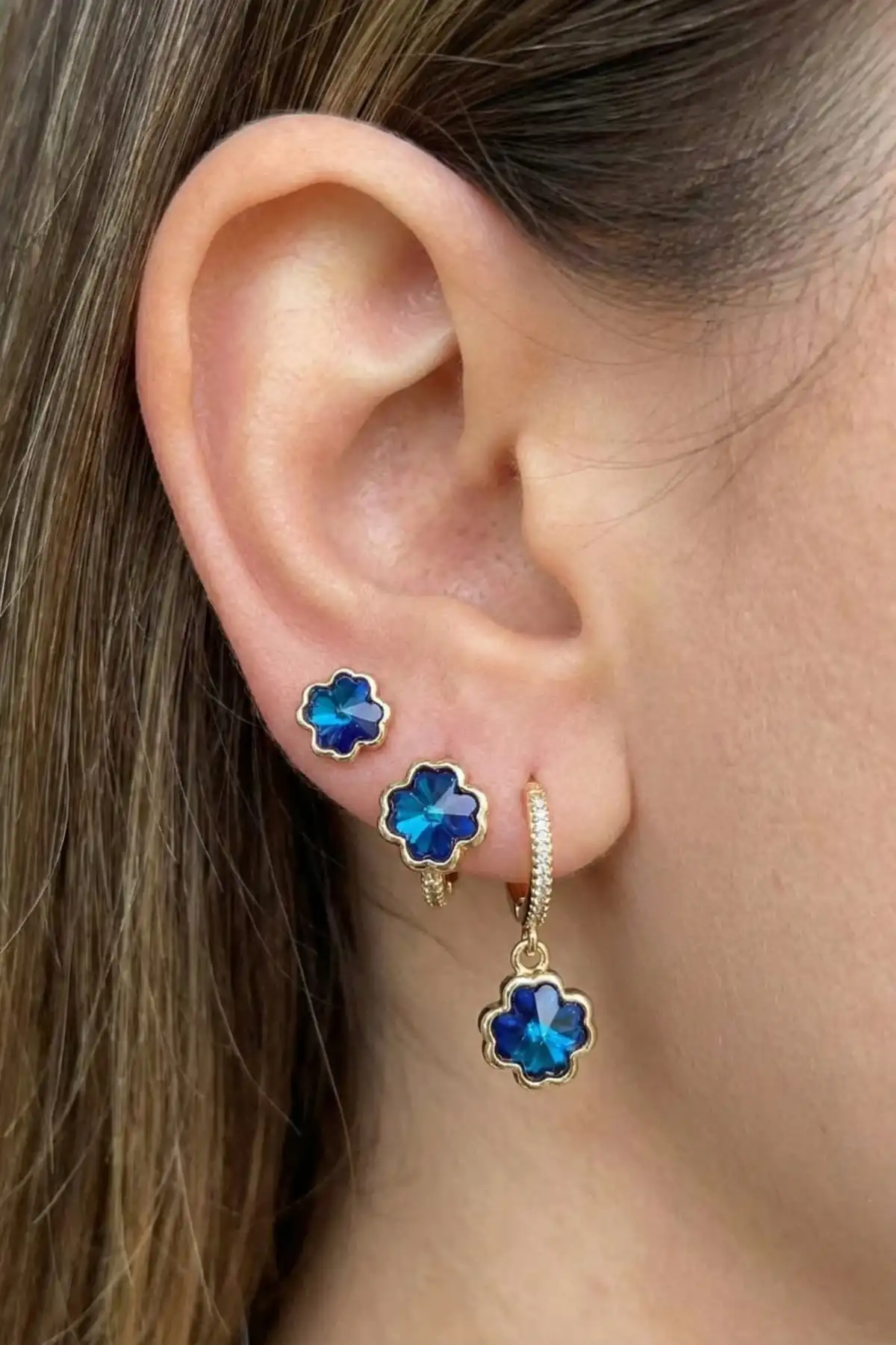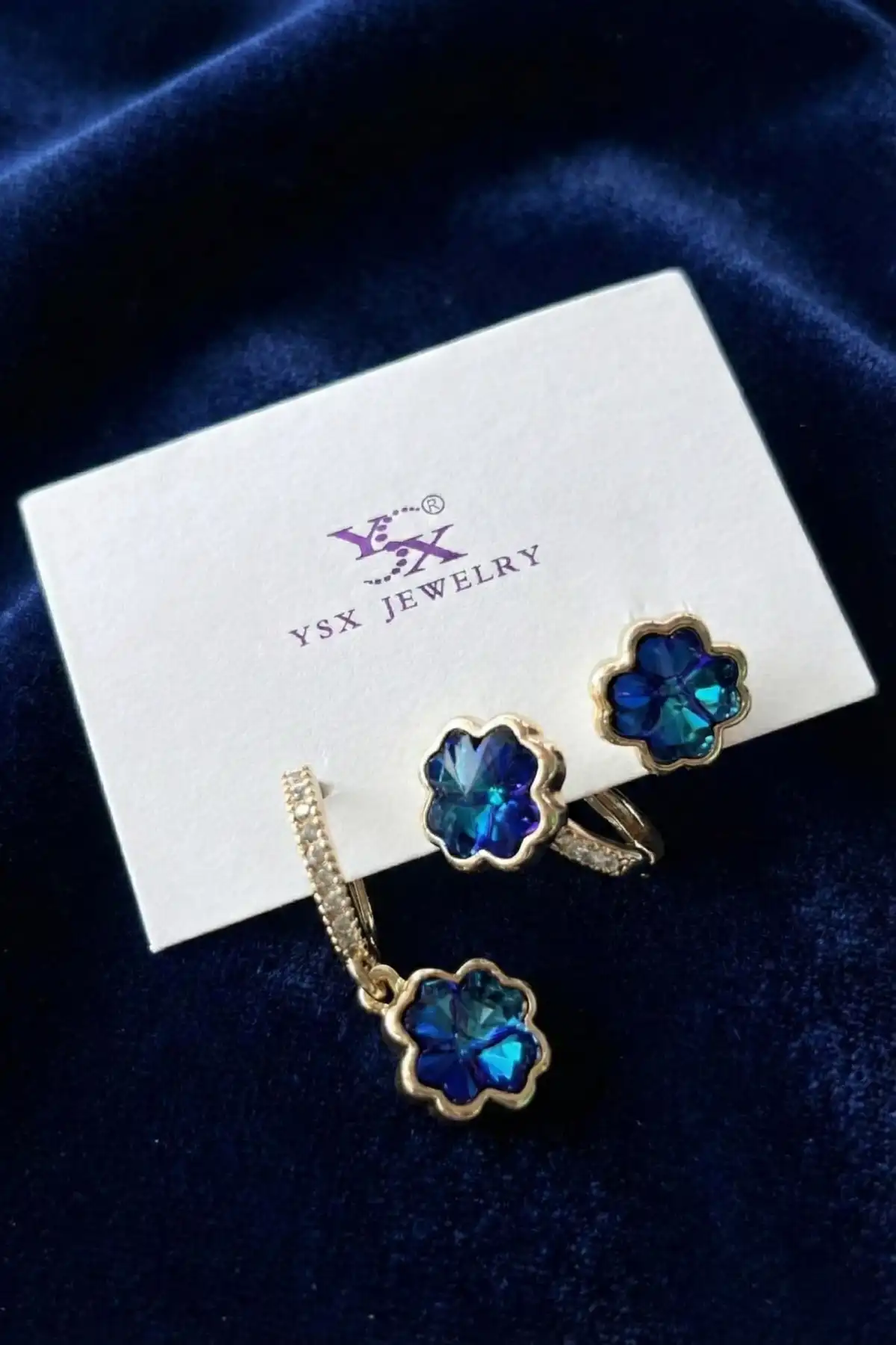 YSX 14K Altın Kaplama Akuamarin Renk Zirkon Taşlı Çiçek Figürlü Sallantılı Küpe
