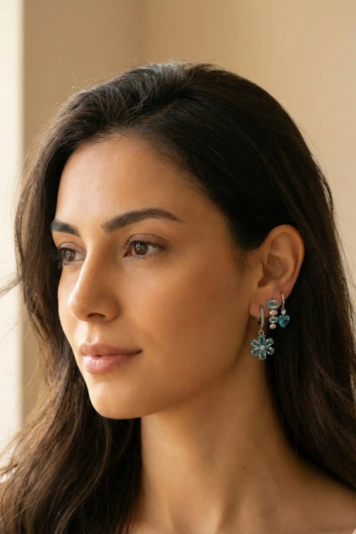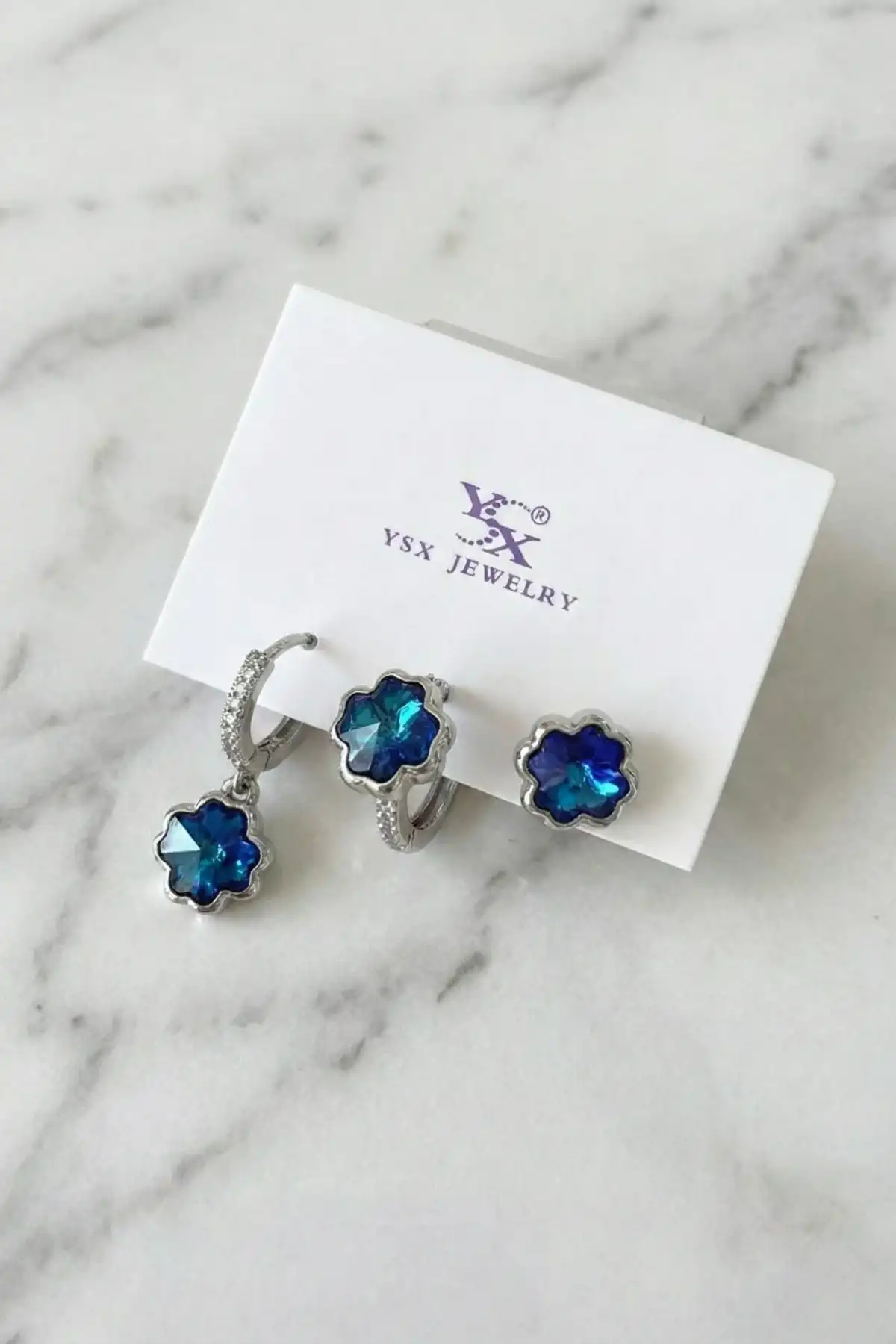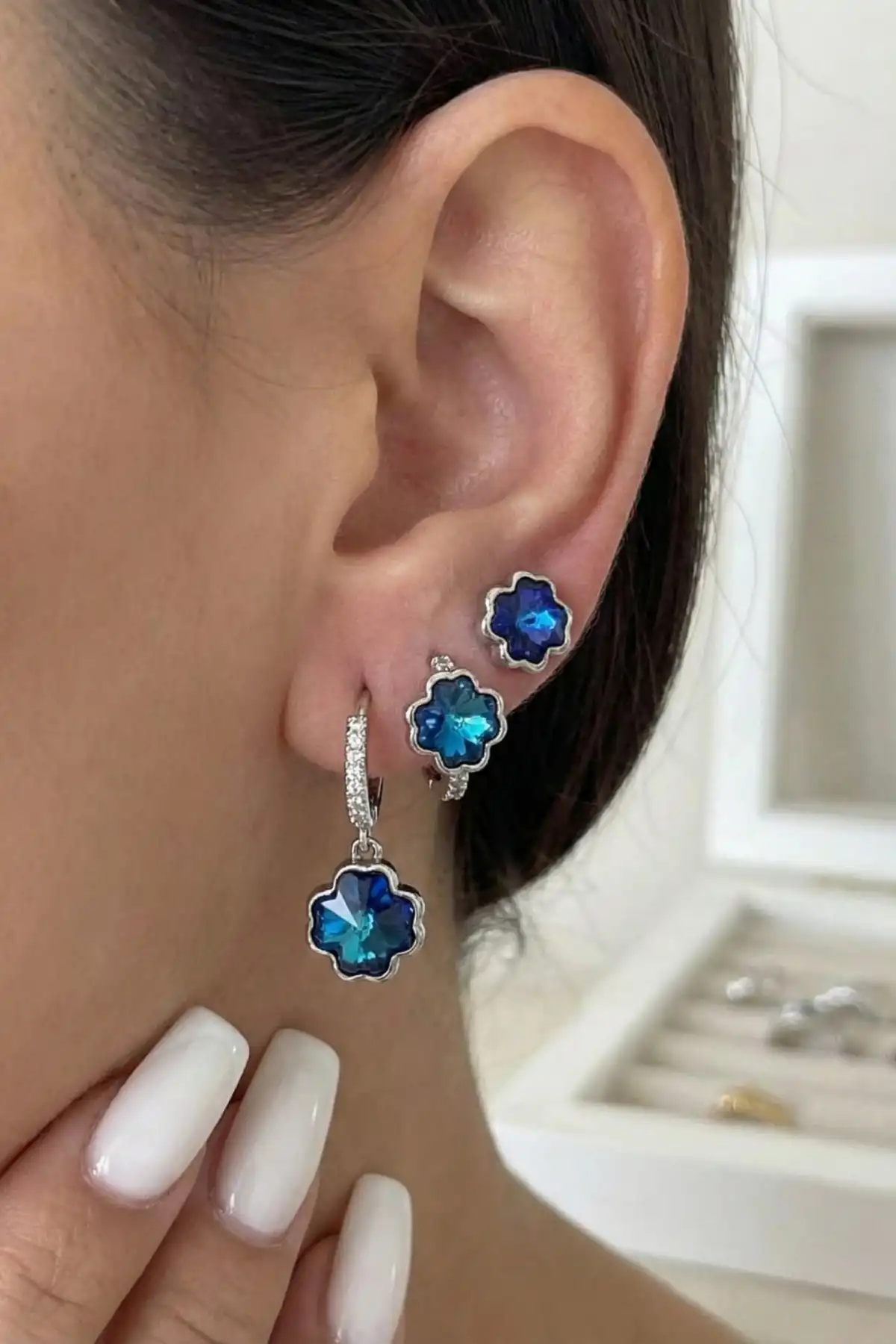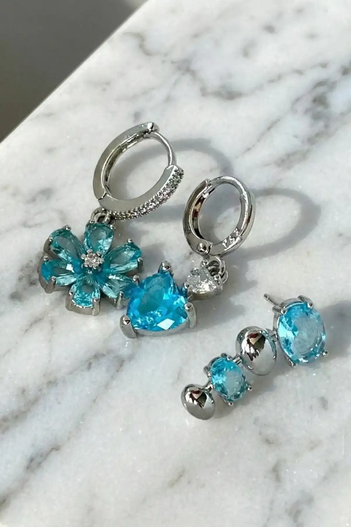 YSX 14K Altın Kaplama Akuamarin Renk Zirkon Taşlı Çiçek Figürlü Sallantılı Küpe
