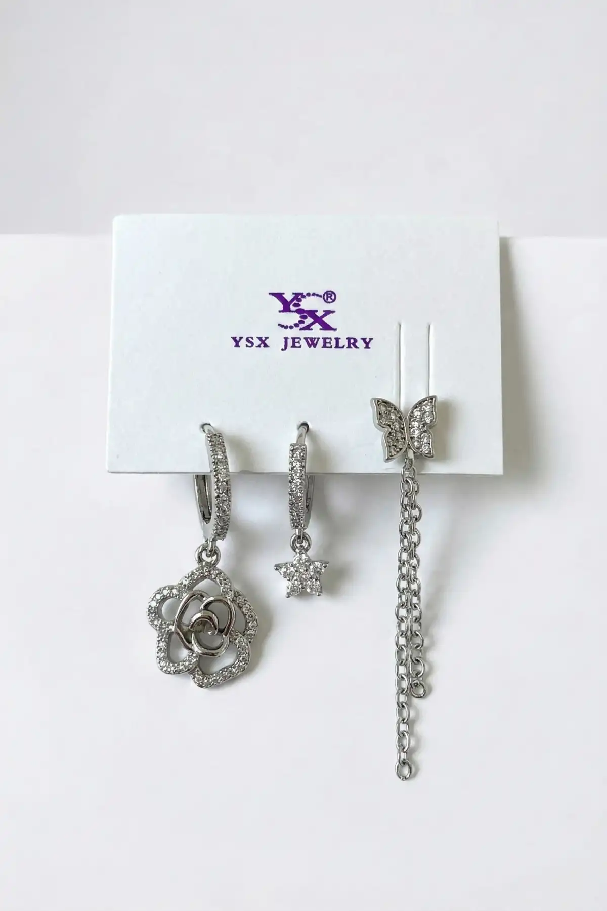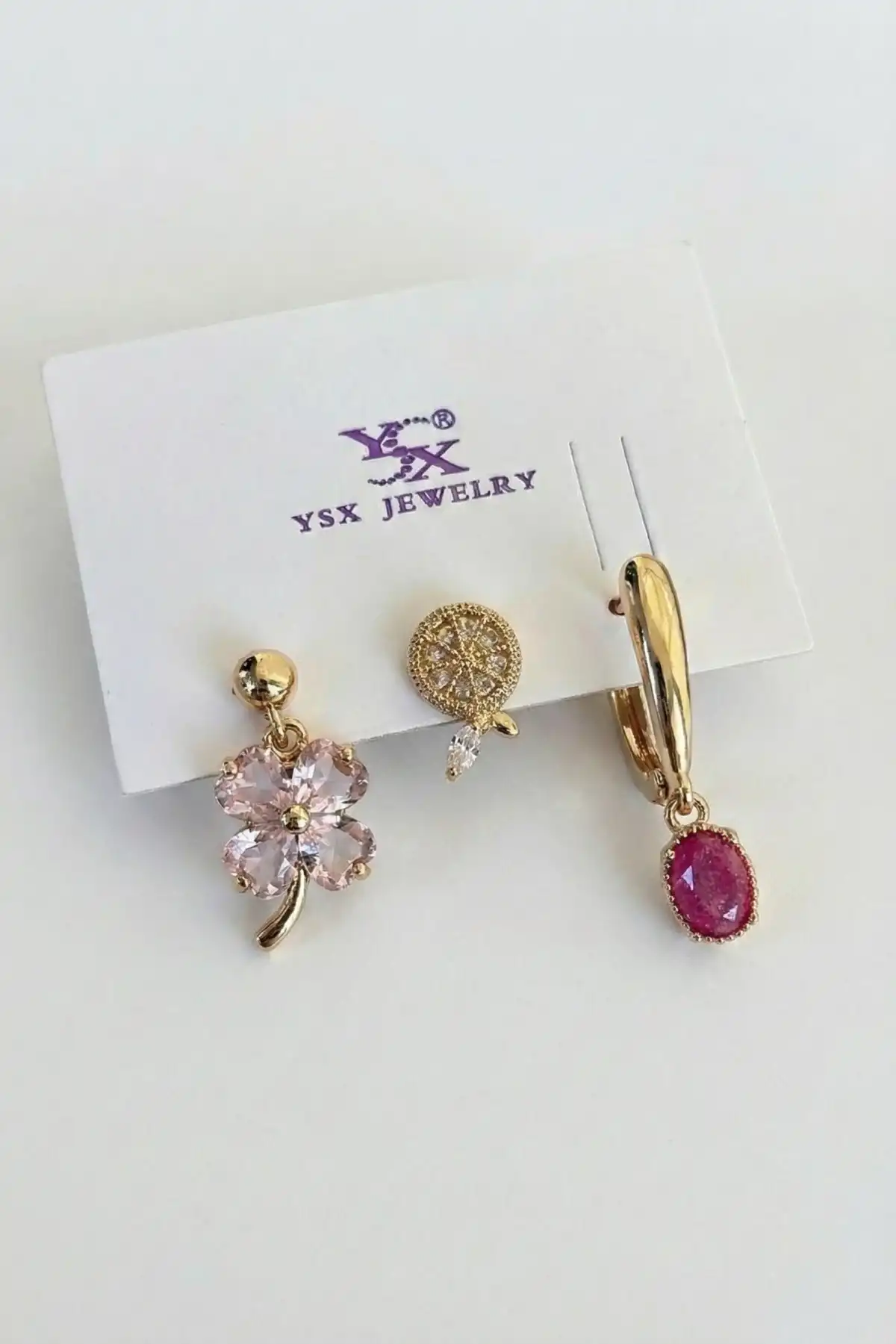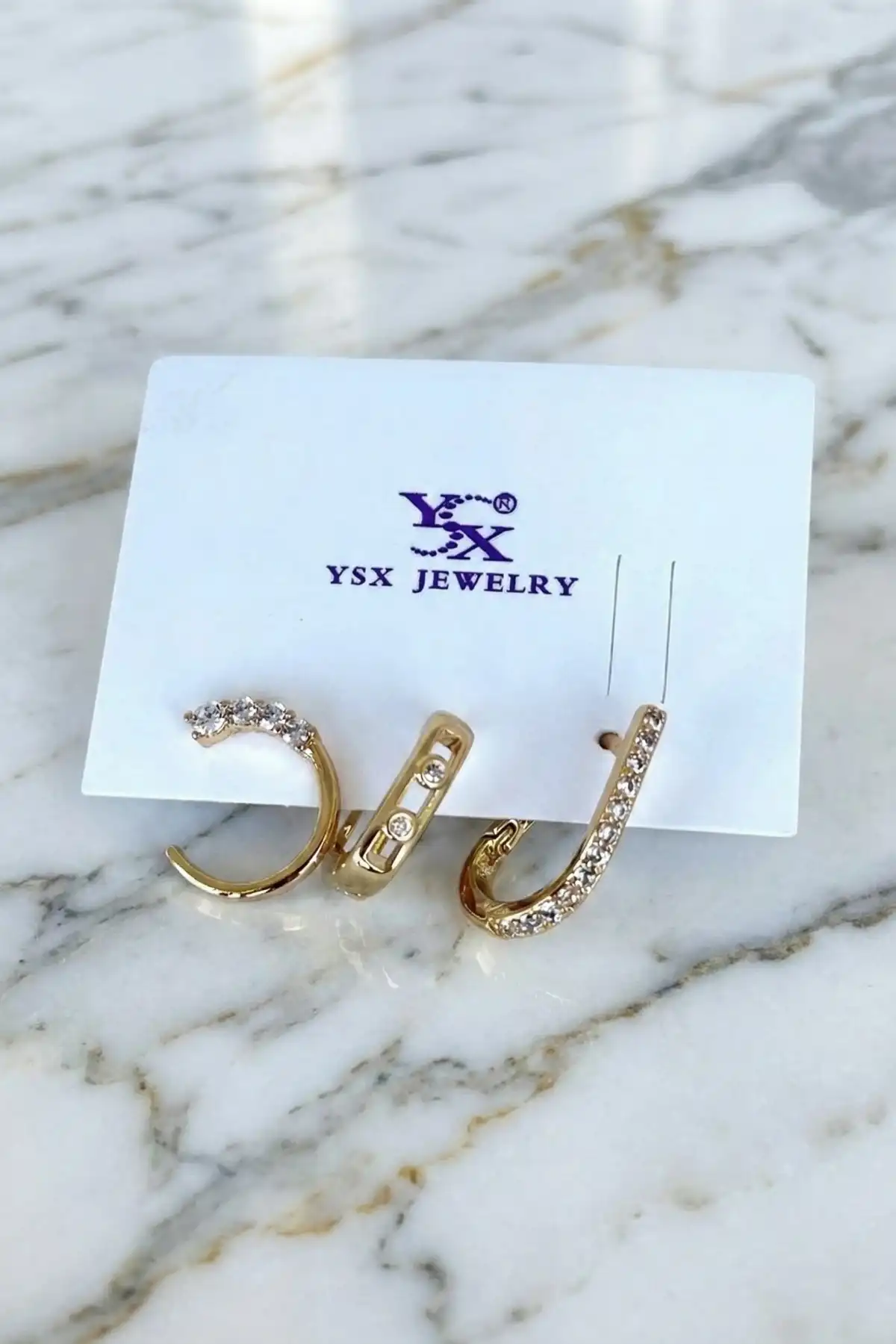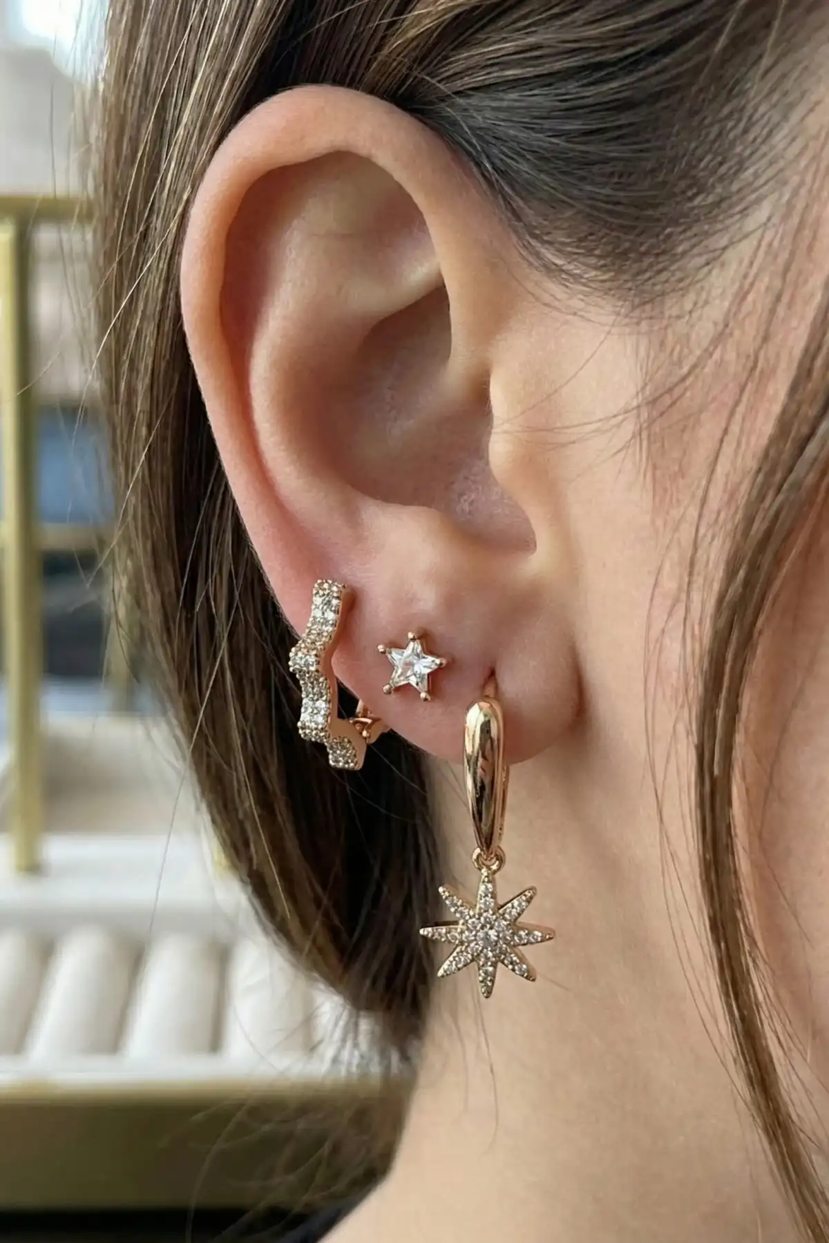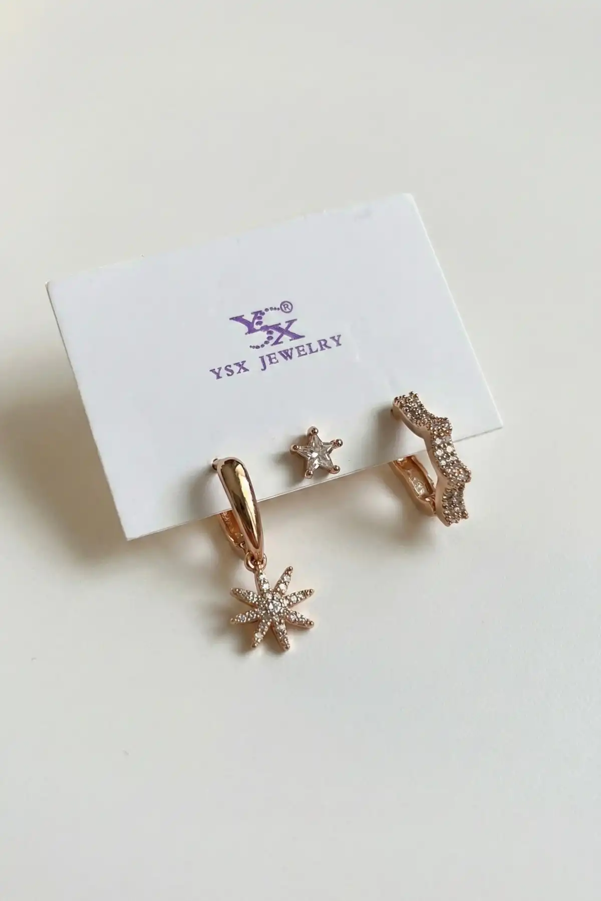 YSX 14K Altın Kaplama Zirkon Taşlı Yıldız Figürlü Çoklu Küpe Seti