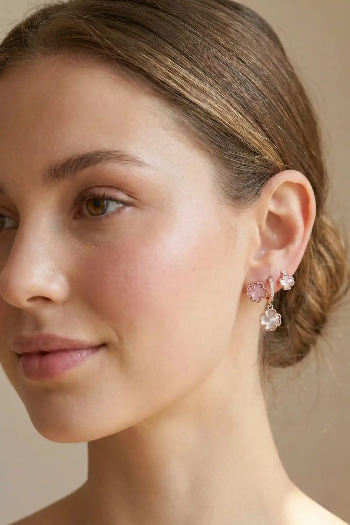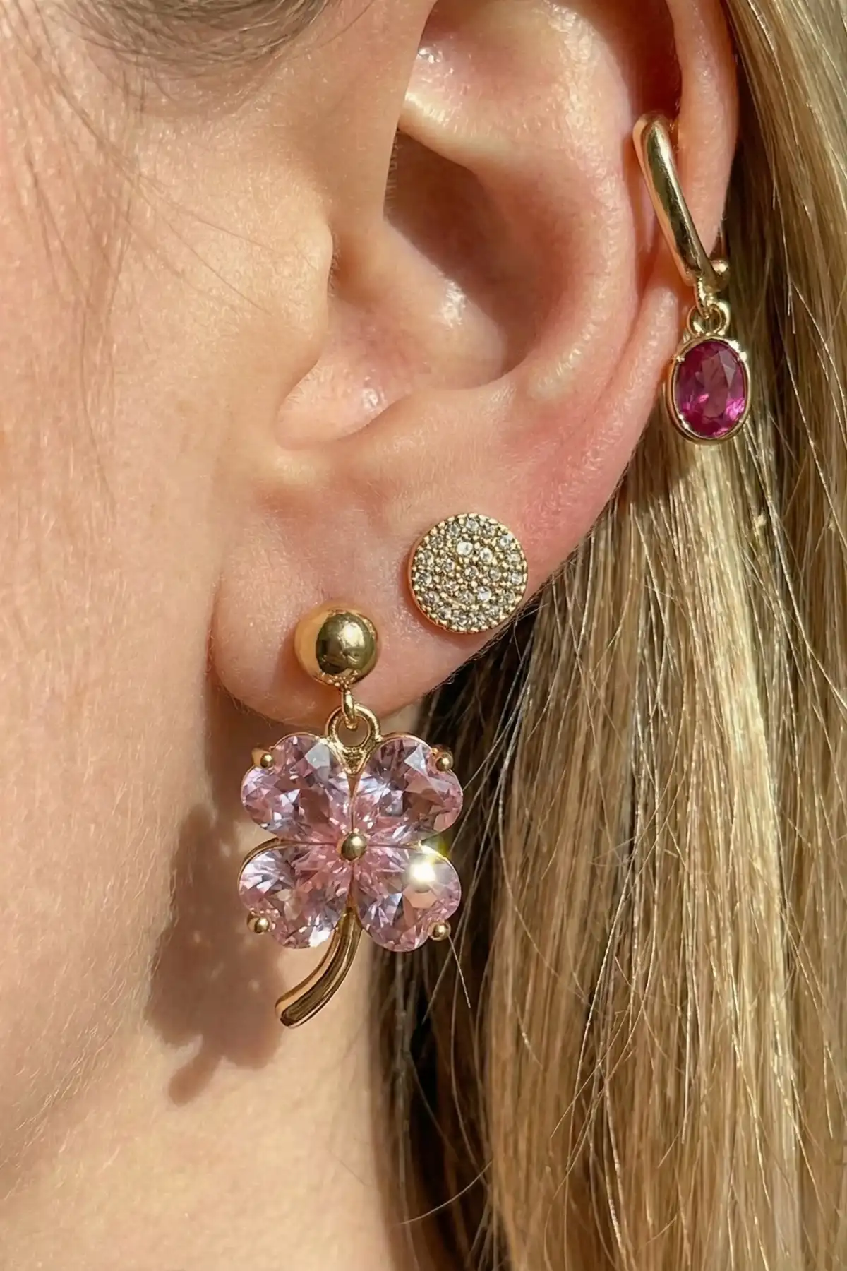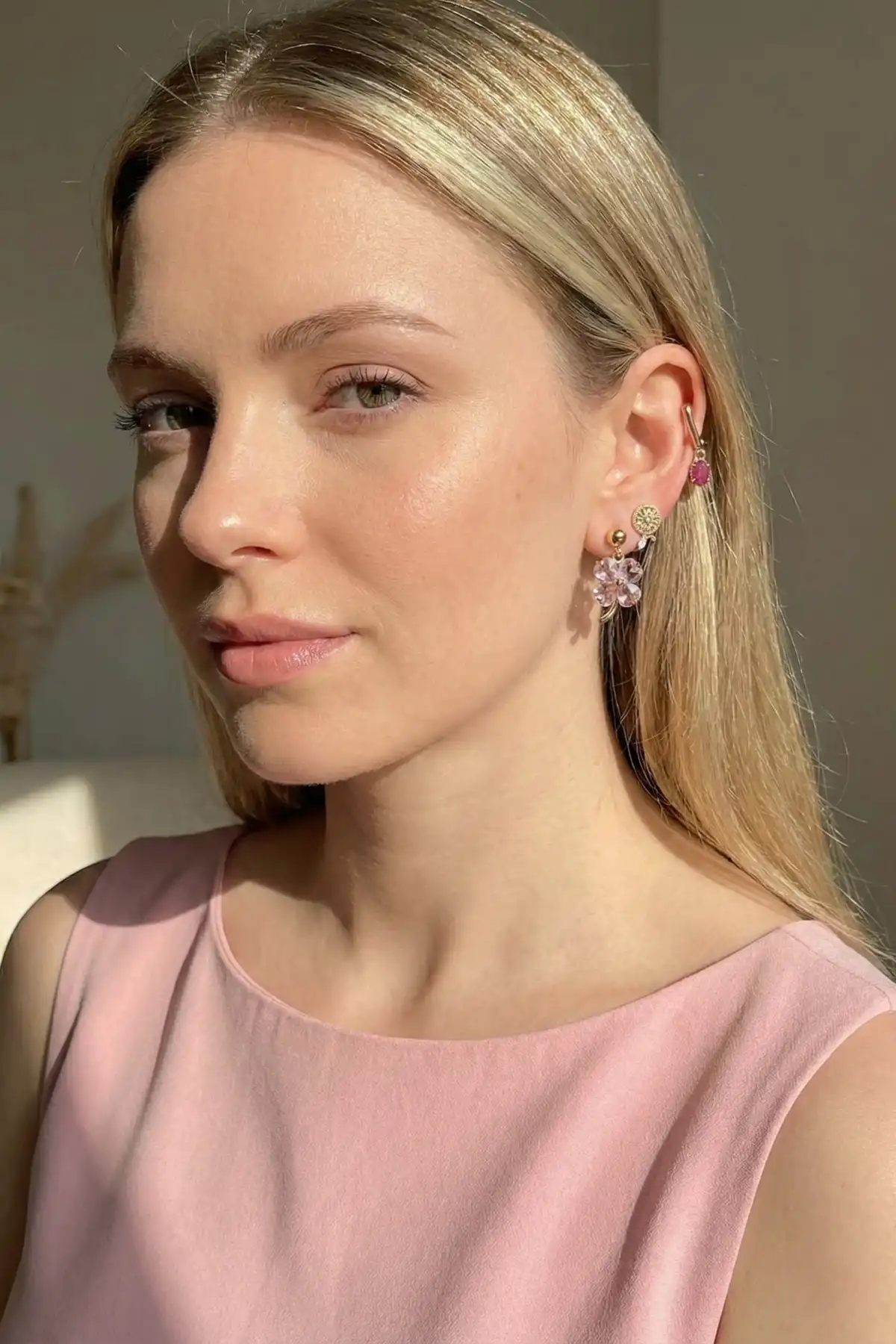 YSX 14K Altın Kaplama Pembe Taş Detaylı Sallantılı Küpe