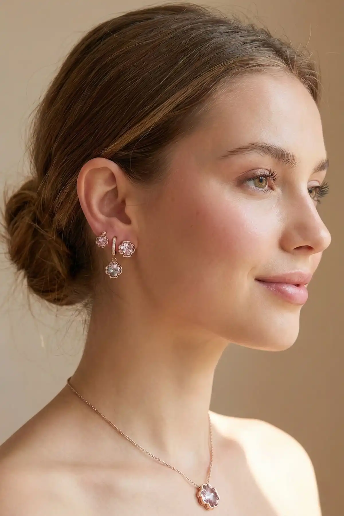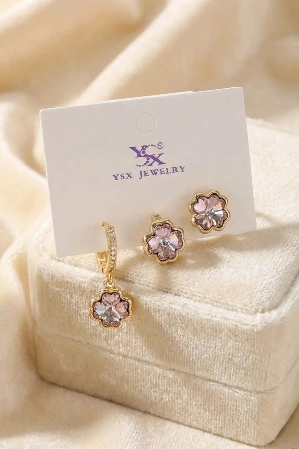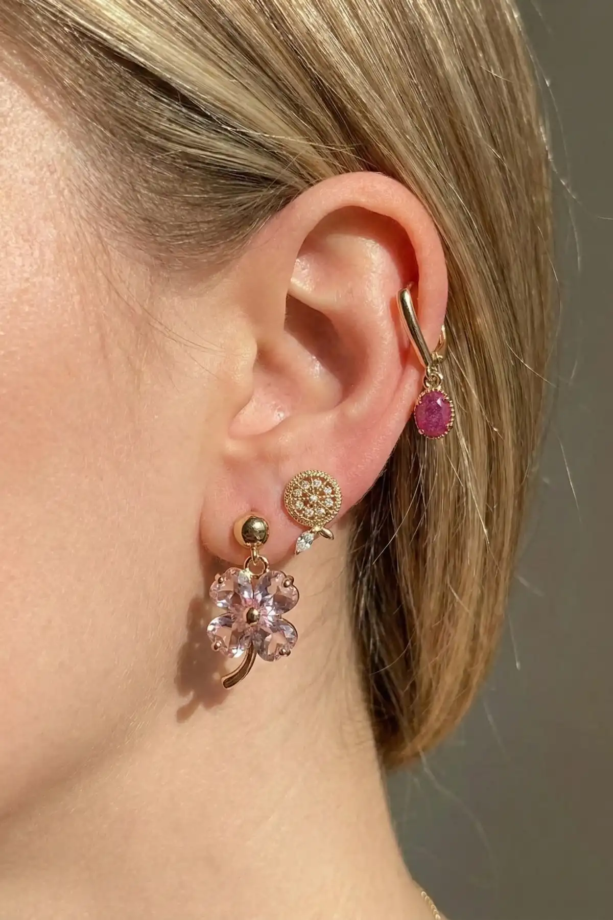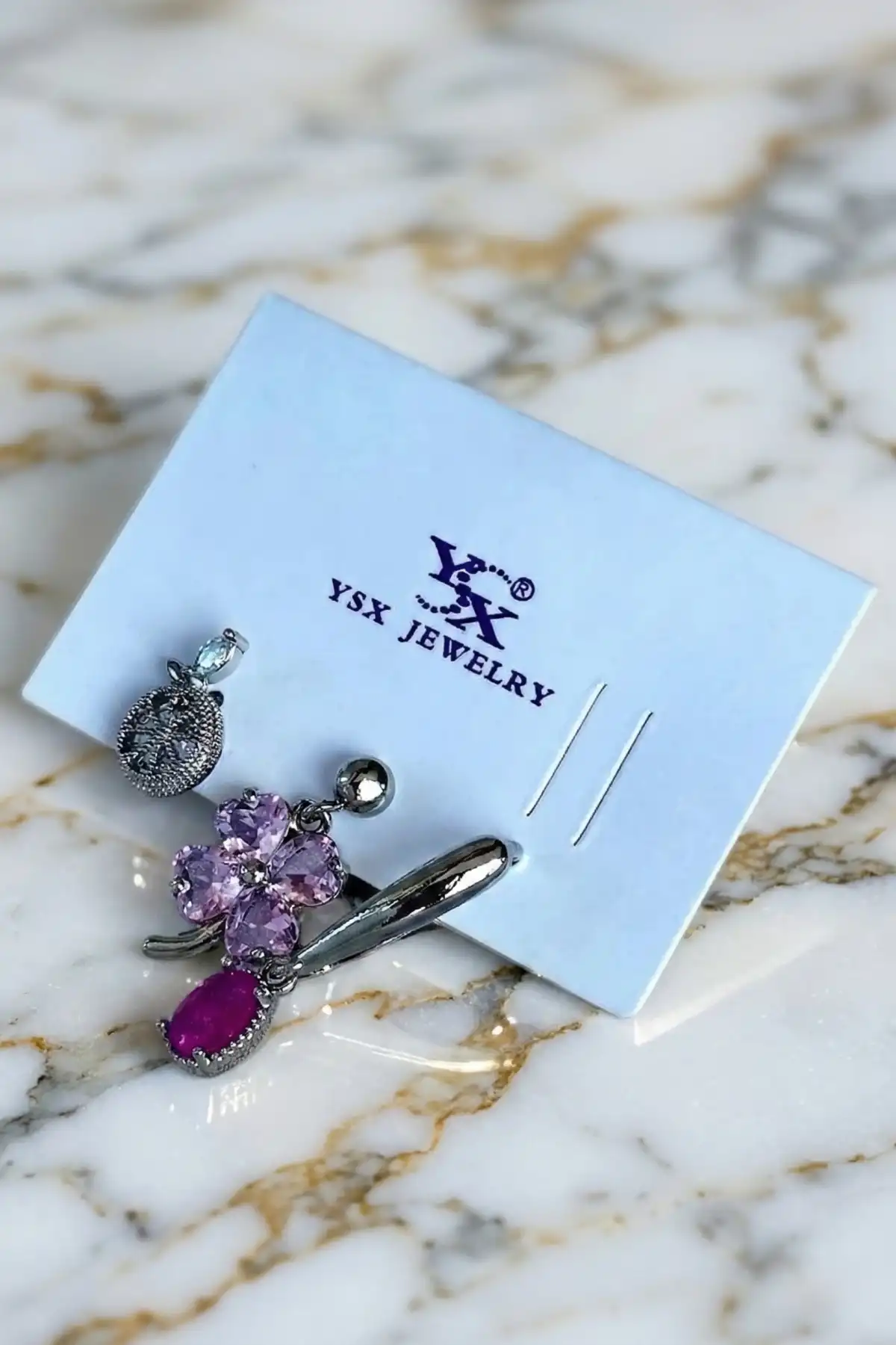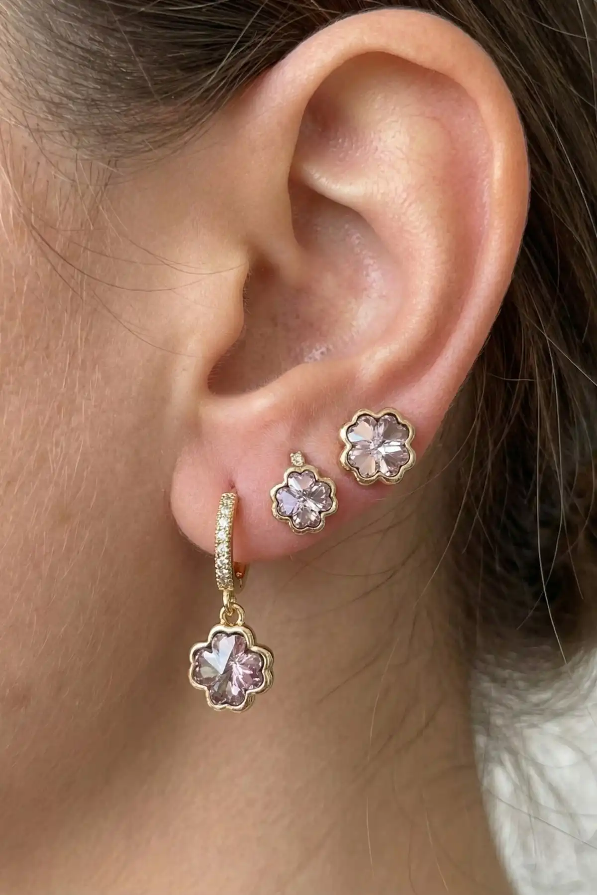 YSX 14K Altın Kaplama Pembe Ametist Renk Zirkon Taşlı Çiçek Form Sallantılı Küpe
